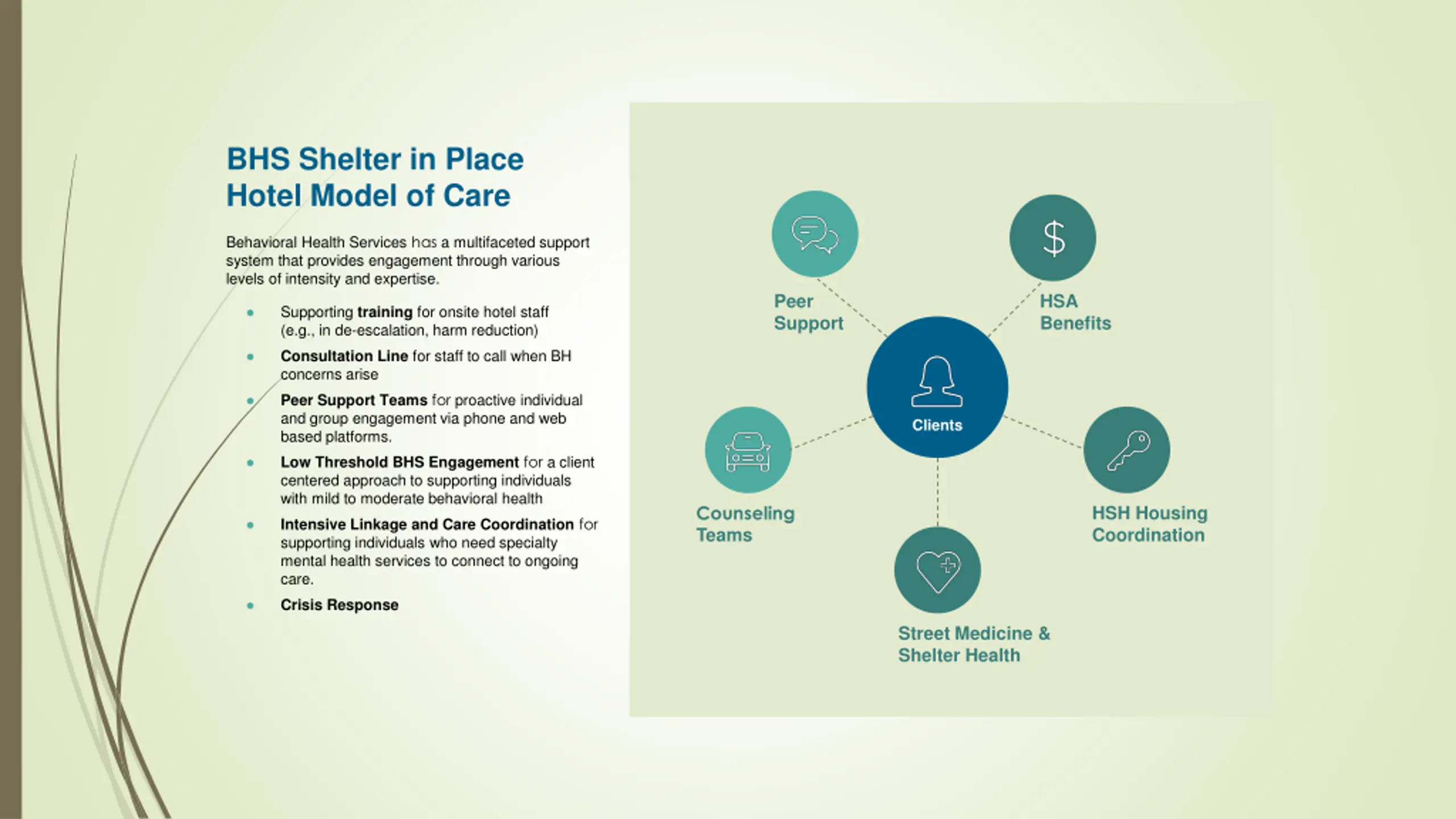 BHS Shelter in Place Hotel Model of Care Behavioral Health Services has a multifaceted support system that provides engagement through various levels of intensity and expertise. Peer Support HSA Benefits Supporting training for onsite hotel staff (e.g., in de-escalation, harm reduction) Consultation Line for staff to call when BH concerns arise Peer Support Teams for proactive individual and group engagement via phone and web based platforms. Low Threshold BHS Engagement for a client centered approach to supporting individuals with mild to moderate behavioral health Intensive Linkage and Care Coordination for supporting individuals who need specialty mental health services to connect to ongoing care. Clients Counseling Teams HSH Housing Coordination Crisis Response Street Medicine & Shelter Health