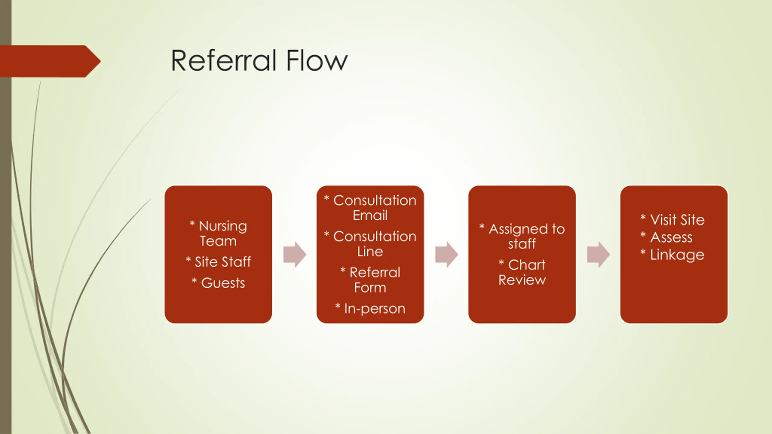 Referral Flow * Consultation Email * Consultation Line * Referral Form * In-person * Visit Site * Assess * Linkage * Nursing Team * Site Staff * Guests * Assigned to staff * Chart Review