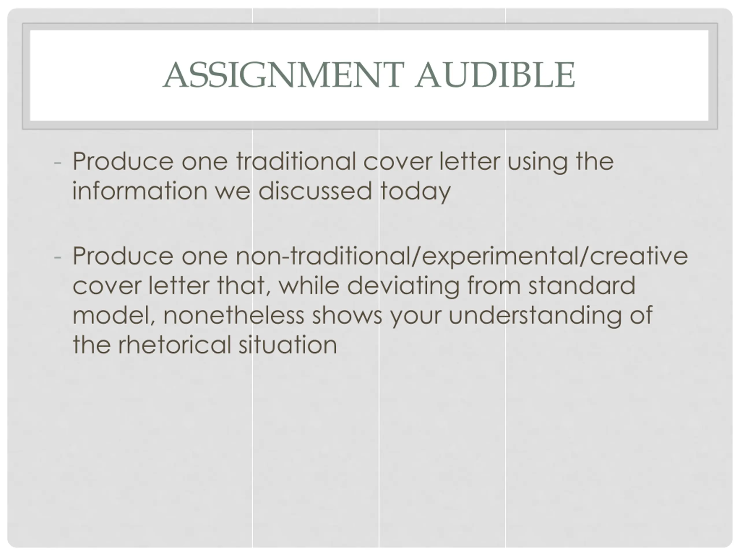 ASSIGNMENT AUDIBLE - Produce one traditional cover letter using the information we discussed today - Produce one non-traditional/experimental/creative cover letter that, while deviating from standard model, nonetheless shows your understanding of the rhetorical situation