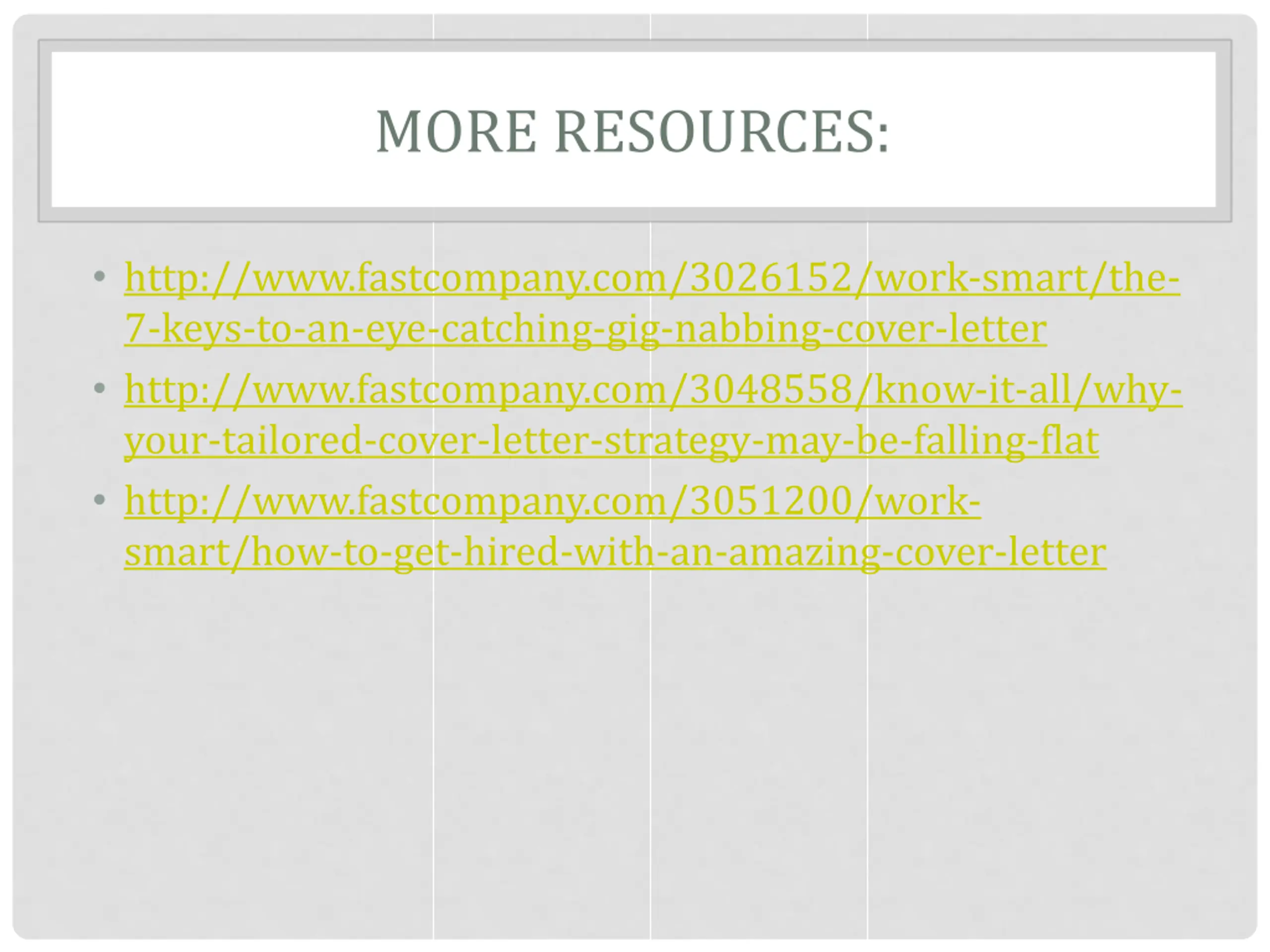 MORE RESOURCES: http://www.fastcompany.com/3026152/work-smart/the- 7-keys-to-an-eye-catching-gig-nabbing-cover-letter http://www.fastcompany.com/3048558/know-it-all/why- your-tailored-cover-letter-strategy-may-be-falling-flat http://www.fastcompany.com/3051200/work- smart/how-to-get-hired-with-an-amazing-cover-letter