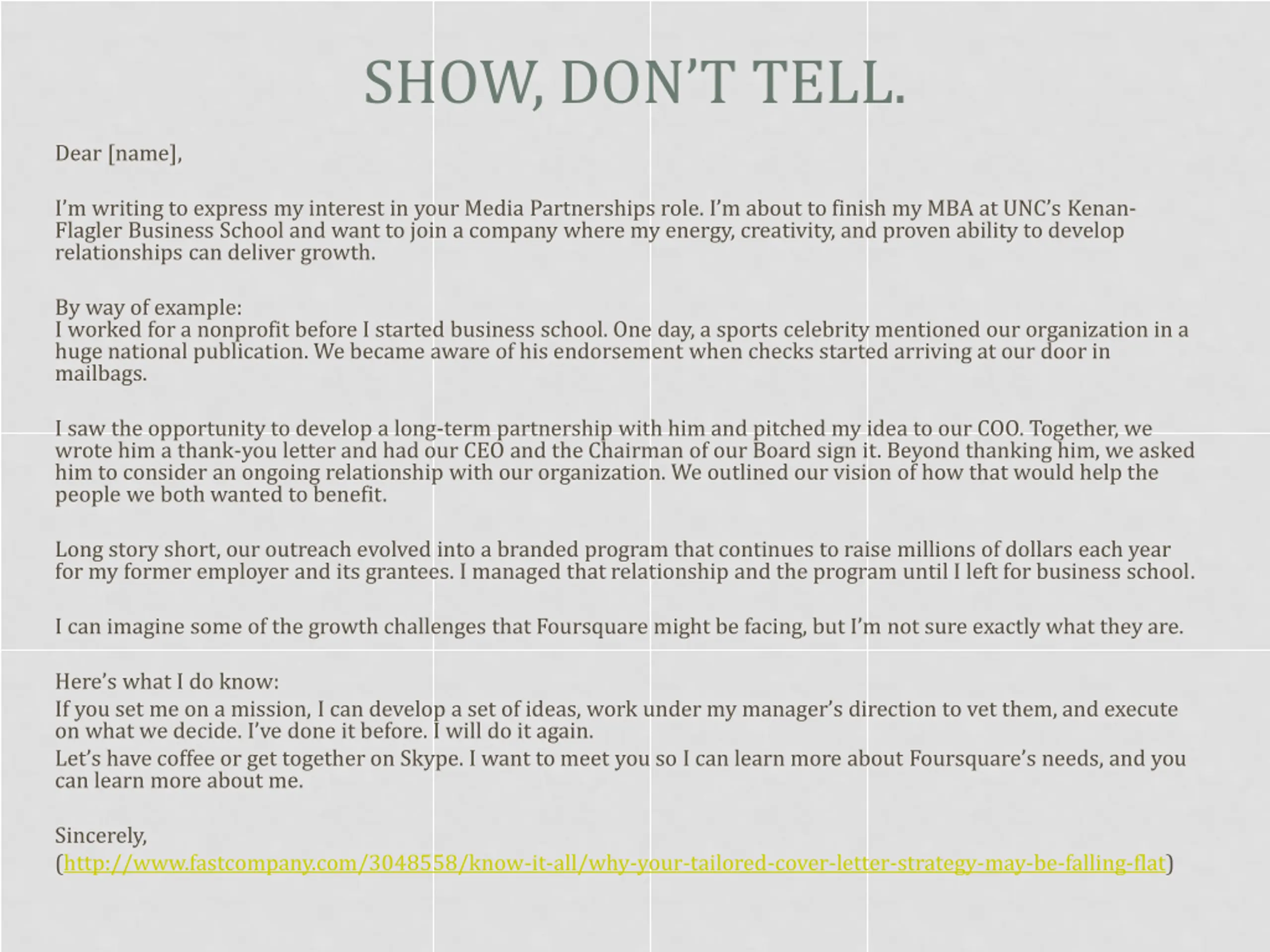 SHOW, DONT TELL. Dear [name], I m writing to express my interest in your Media Partnerships role. I m about to finish my MBA at UNC s Kenan- Flagler Business School and want to join a company where my energy, creativity, and proven ability to develop relationships can deliver growth. By way of example: I worked for a nonprofit before I started business school. One day, a sports celebrity mentioned our organization in a huge national publication. We became aware of his endorsement when checks started arriving at our door in mailbags. I saw the opportunity to develop a long-term partnership with him and pitched my idea to our COO. Together, we wrote him a thank-you letter and had our CEO and the Chairman of our Board sign it. Beyond thanking him, we asked him to consider an ongoing relationship with our organization. We outlined our vision of how that would help the people we both wanted to benefit. Long story short, our outreach evolved into a branded program that continues to raise millions of dollars each year for my former employer and its grantees. I managed that relationship and the program until I left for business school. I can imagine some of the growth challenges that Foursquare might be facing, but I m not sure exactly what they are. Here s what I do know: If you set me on a mission, I can develop a set of ideas, work under my manager s direction to vet them, and execute on what we decide. I ve done it before. I will do it again. Let s have coffee or get together on Skype. I want to meet you so I can learn more about Foursquare s needs, and you can learn more about me. Sincerely, (http://www.fastcompany.com/3048558/know-it-all/why-your-tailored-cover-letter-strategy-may-be-falling-flat)