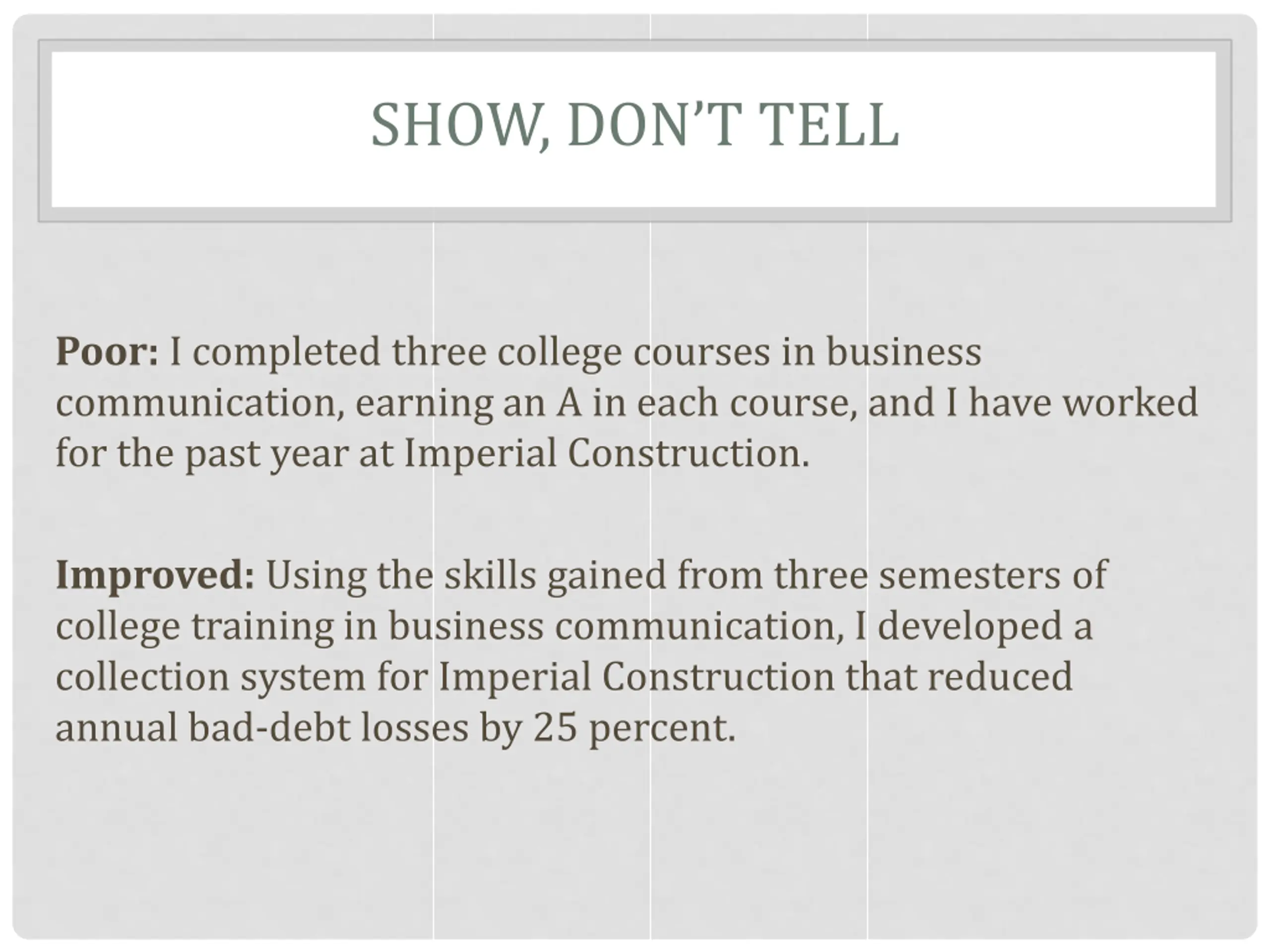 SHOW, DONT TELL Poor: I completed three college courses in business communication, earning an A in each course, and I have worked for the past year at Imperial Construction. Improved: Using the skills gained from three semesters of college training in business communication, I developed a collection system for Imperial Construction that reduced annual bad-debt losses by 25 percent.