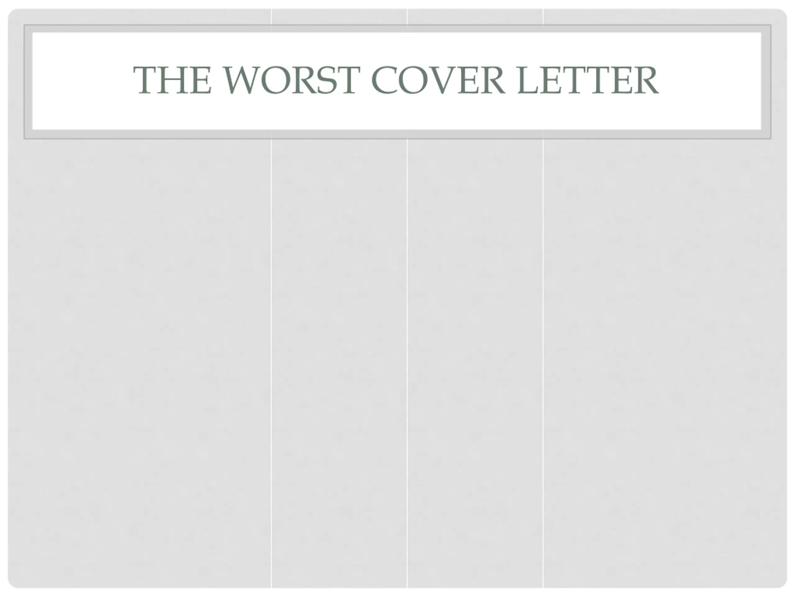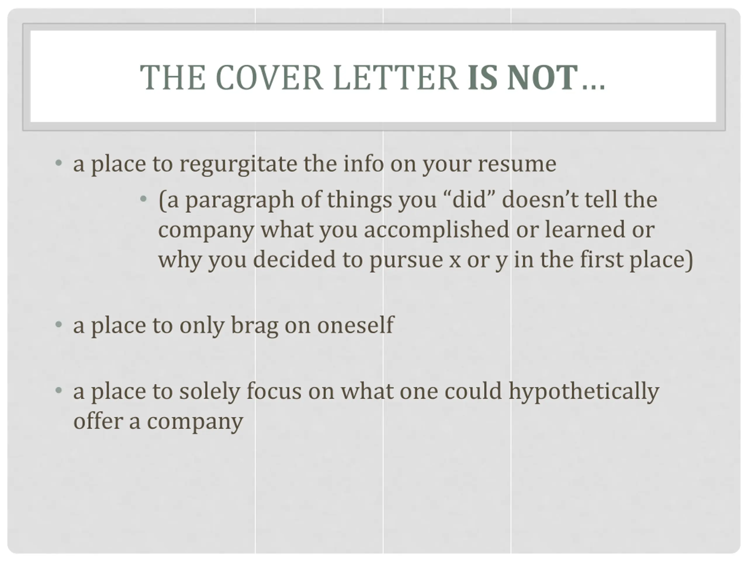 THE COVER LETTER IS NOT a place to regurgitate the info on your resume (a paragraph of things you did doesn t tell the company what you accomplished or learned or why you decided to pursue x or y in the first place) a place to only brag on oneself a place to solely focus on what one could hypothetically offer a company