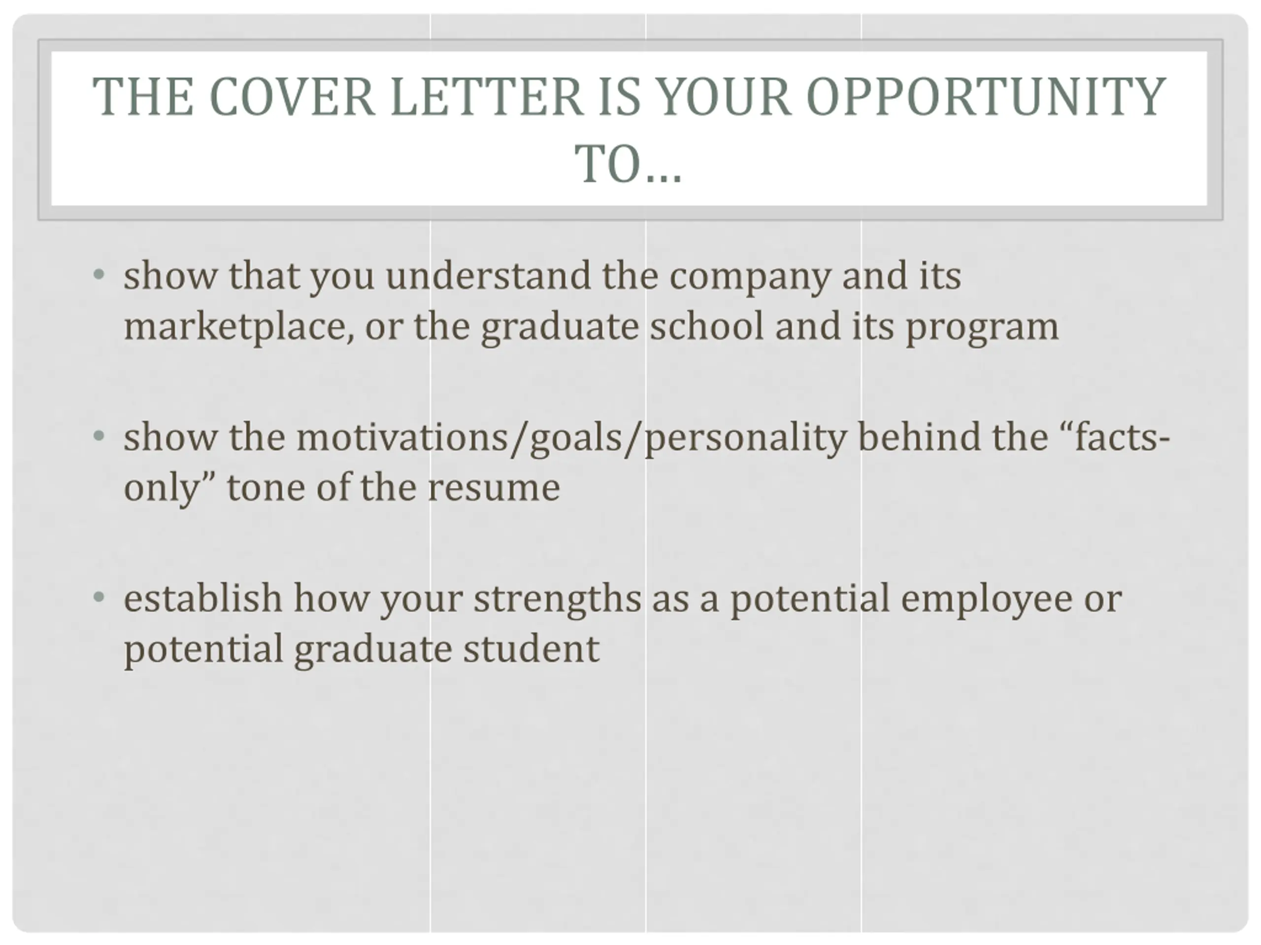 THE COVER LETTER IS YOUR OPPORTUNITY TO show that you understand the company and its marketplace, or the graduate school and its program show the motivations/goals/personality behind the facts- only tone of the resume establish how your strengths as a potential employee or potential graduate student