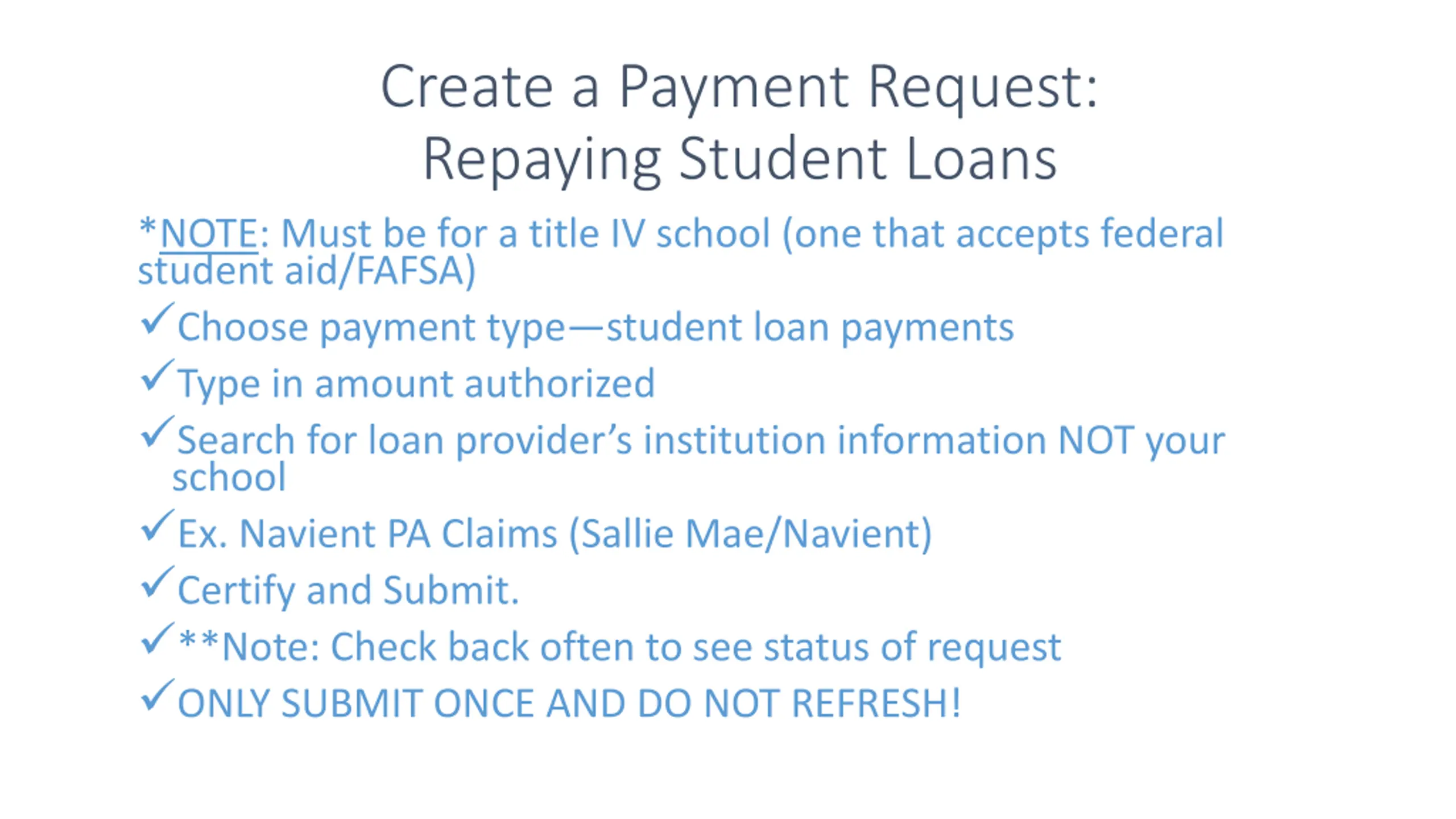 Create a Payment Request: Repaying Student Loans *NOTE: Must be for a title IV school (one that accepts federal student aid/FAFSA) Choose payment type student loan payments Type in amount authorized Search for loan provider s institution information NOT your school Ex. Navient PA Claims (Sallie Mae/Navient) Certify and Submit. **Note: Check back often to see status of request ONLY SUBMIT ONCE AND DO NOT REFRESH!