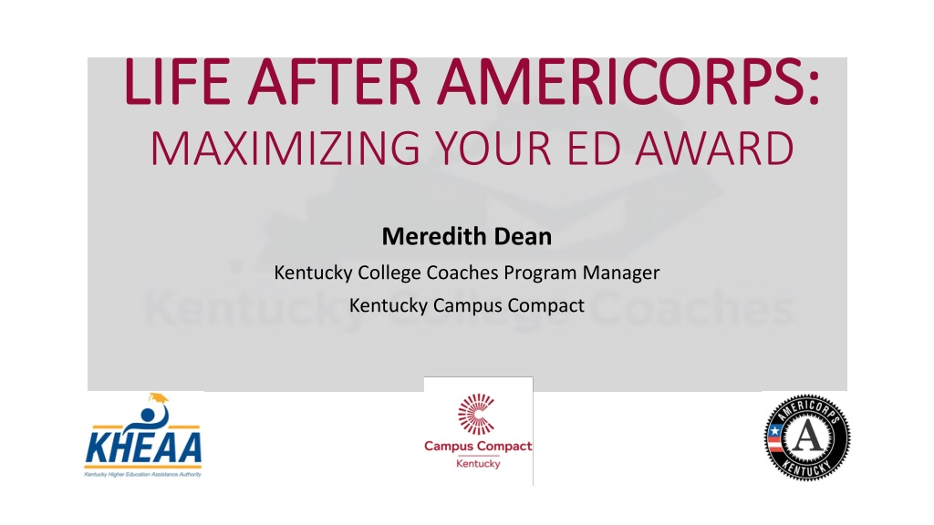 LIFE AFTER AMERICORPS: LIFE AFTER AMERICORPS: MAXIMIZING YOUR ED AWARD Meredith Dean Kentucky College Coaches Program Manager Kentucky Campus Compact