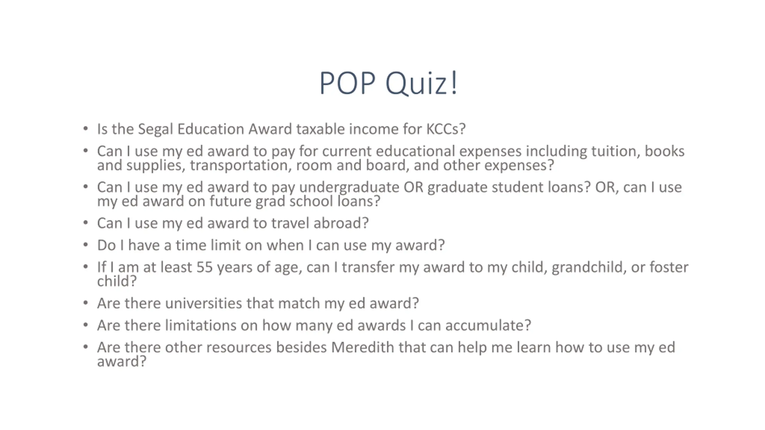POP Quiz! Is the Segal Education Award taxable income for KCCs? Can I use my ed award to pay for current educational expenses including tuition, books and supplies, transportation, room and board, and other expenses? Can I use my ed award to pay undergraduate OR graduate student loans? OR, can I use my ed award on future grad school loans? Can I use my ed award to travel abroad? Do I have a time limit on when I can use my award? If I am at least 55 years of age, can I transfer my award to my child, grandchild, or foster child? Are there universities that match my ed award? Are there limitations on how many ed awards I can accumulate? Are there other resources besides Meredith that can help me learn how to use my ed award?