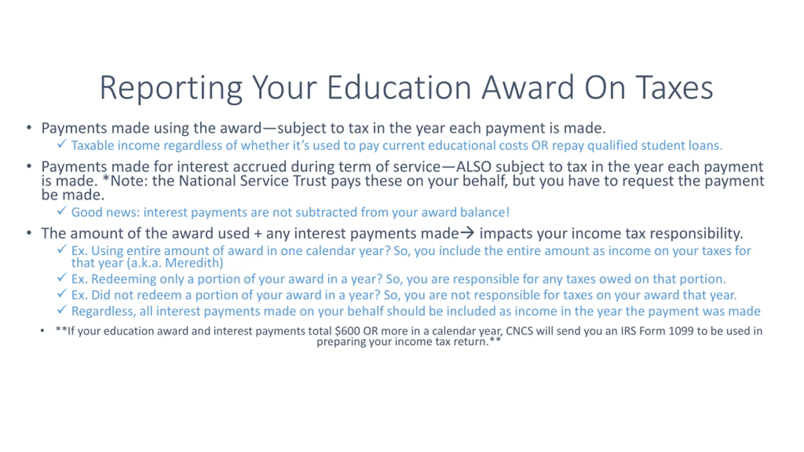 Reporting Your Education Award On Taxes Payments made using the award subject to tax in the year each payment is made. Taxable income regardless of whether it s used to pay current educational costs OR repay qualified student loans. Payments made for interest accrued during term of service ALSO subject to tax in the year each payment is made. *Note: the National Service Trust pays these on your behalf, but you have to request the payment be made. Good news: interest payments are not subtracted from your award balance! The amount of the award used + any interest payments made impacts your income tax responsibility. Ex. Using entire amount of award in one calendar year? So, you include the entire amount as income on your taxes for that year (a.k.a. Meredith) Ex. Redeeming only a portion of your award in a year? So, you are responsible for any taxes owed on that portion. Ex. Did not redeem a portion of your award in a year? So, you are not responsible for taxes on your award that year. Regardless, all interest payments made on your behalf should be included as income in the year the payment was made **If your education award and interest payments total $600 OR more in a calendar year, CNCS will send you an IRS Form 1099 to be used in preparing your income tax return.**