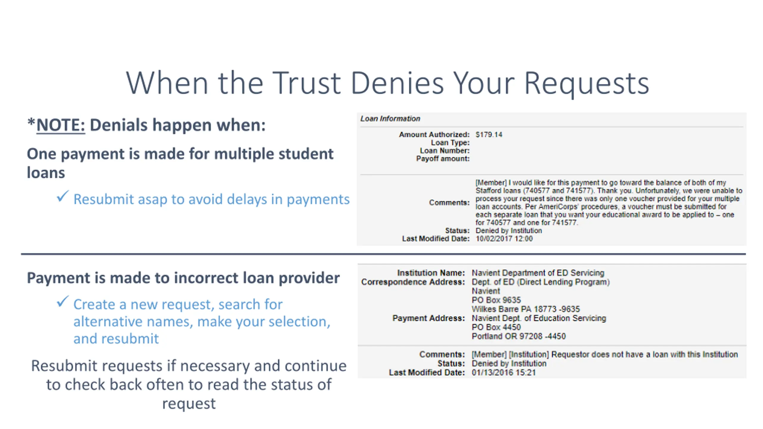 When the Trust Denies Your Requests *NOTE: Denials happen when: One payment is made for multiple student loans Resubmit asap to avoid delays in payments Payment is made to incorrect loan provider Create a new request, search for alternative names, make your selection, and resubmit Resubmit requests if necessary and continue to check back often to read the status of request