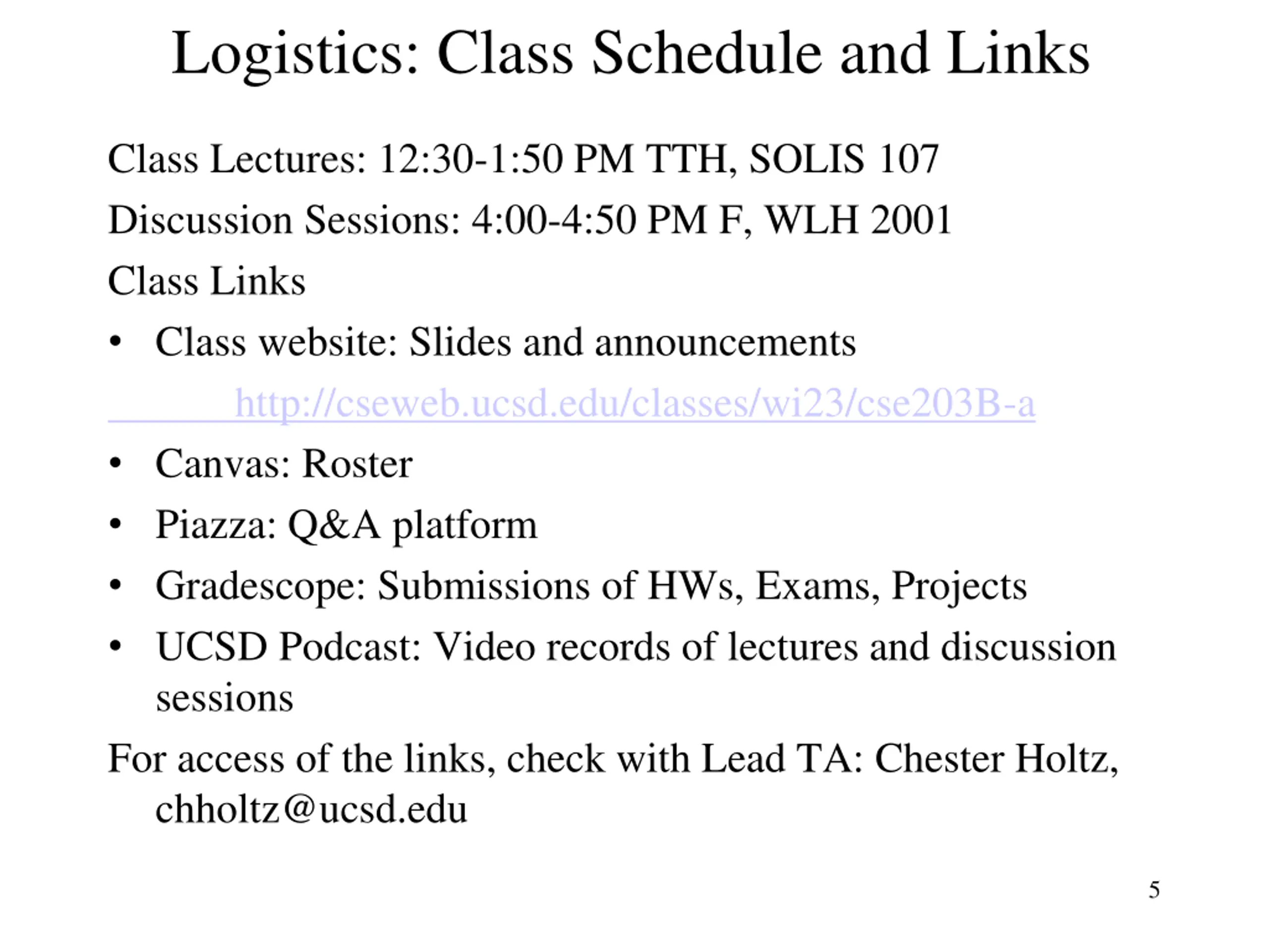 Logistics: Class Schedule and Links Class Lectures: 12:30-1:50 PM TTH, SOLIS 107 Discussion Sessions: 4:00-4:50 PM F, WLH 2001 Class Links Class website: Slides and announcements http://cseweb.ucsd.edu/classes/wi23/cse203B-a Canvas: Roster Piazza: Q&A platform Gradescope: Submissions of HWs, Exams, Projects UCSD Podcast: Video records of lectures and discussion sessions For access of the links, check with Lead TA: Chester Holtz, chholtz@ucsd.edu 5