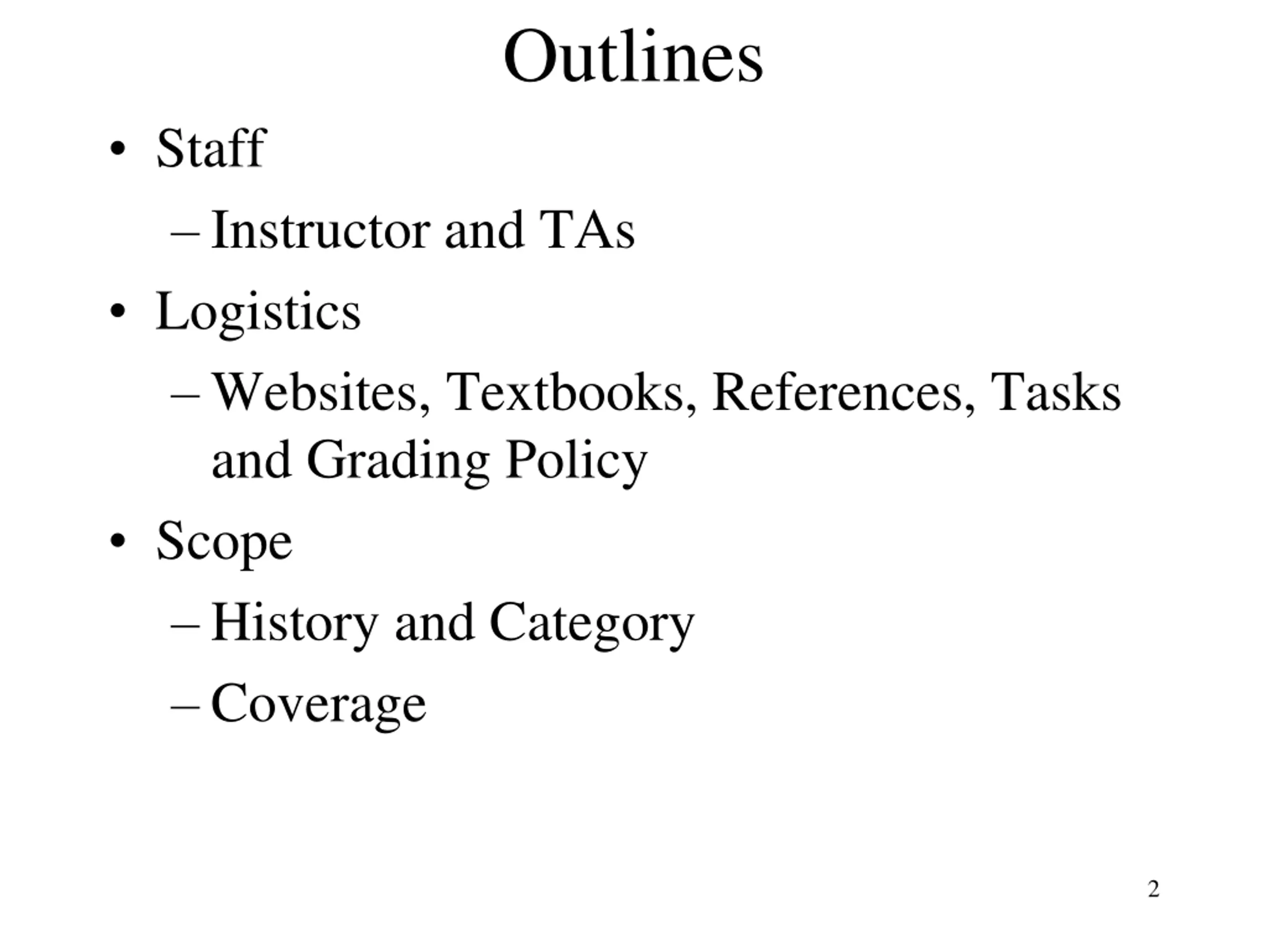 Outlines Staff Instructor and TAs Logistics Websites, Textbooks, References, Tasks and Grading Policy Scope History and Category Coverage 2