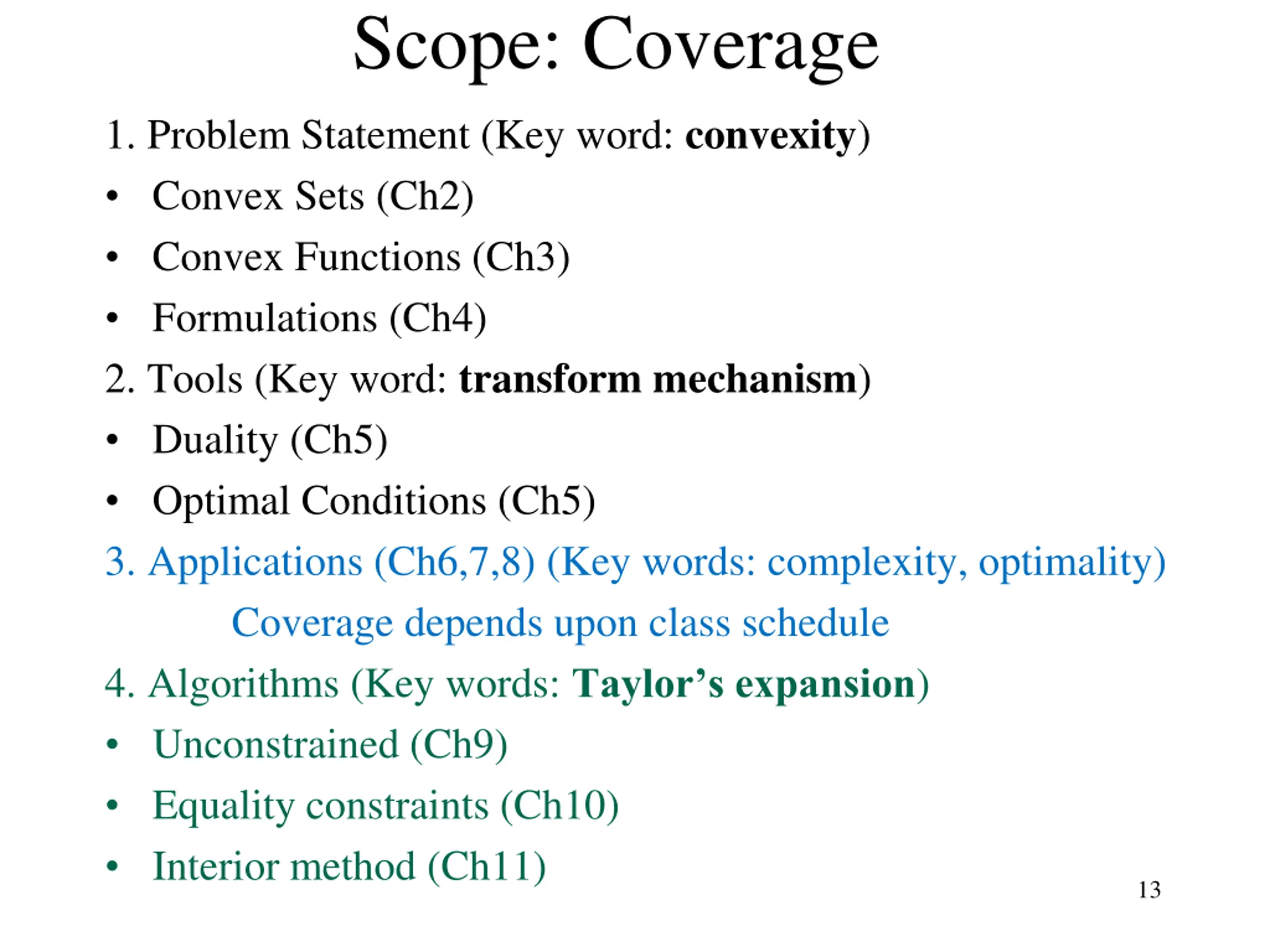 Scope: Coverage 1. Problem Statement (Key word: convexity) Convex Sets (Ch2) Convex Functions (Ch3) Formulations (Ch4) 2. Tools (Key word: transform mechanism) Duality (Ch5) Optimal Conditions (Ch5) 3. Applications (Ch6,7,8) (Key words: complexity, optimality) Coverage depends upon class schedule 4. Algorithms (Key words: Taylor s expansion) Unconstrained (Ch9) Equality constraints (Ch10) Interior method (Ch11) 13