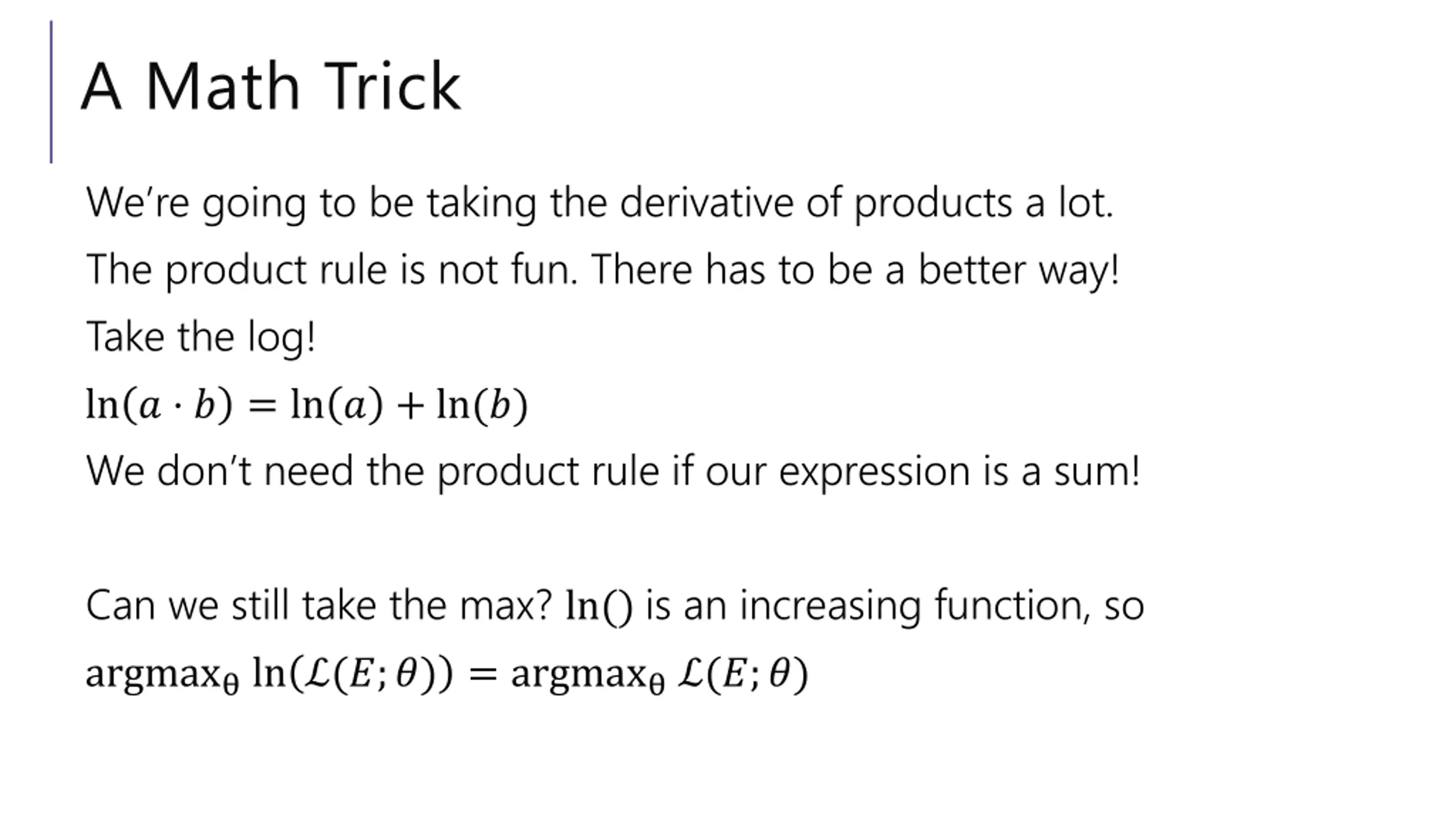 A Math Trick We re going to be taking the derivative of products a lot. The product rule is not fun. There has to be a better way! Take the log! ln ? ? = ln ? + ln(?) We don t need the product rule if our expression is a sum! Can we still take the max? ln() is an increasing function, so argmax ln (?;?) = argmax (?;?)