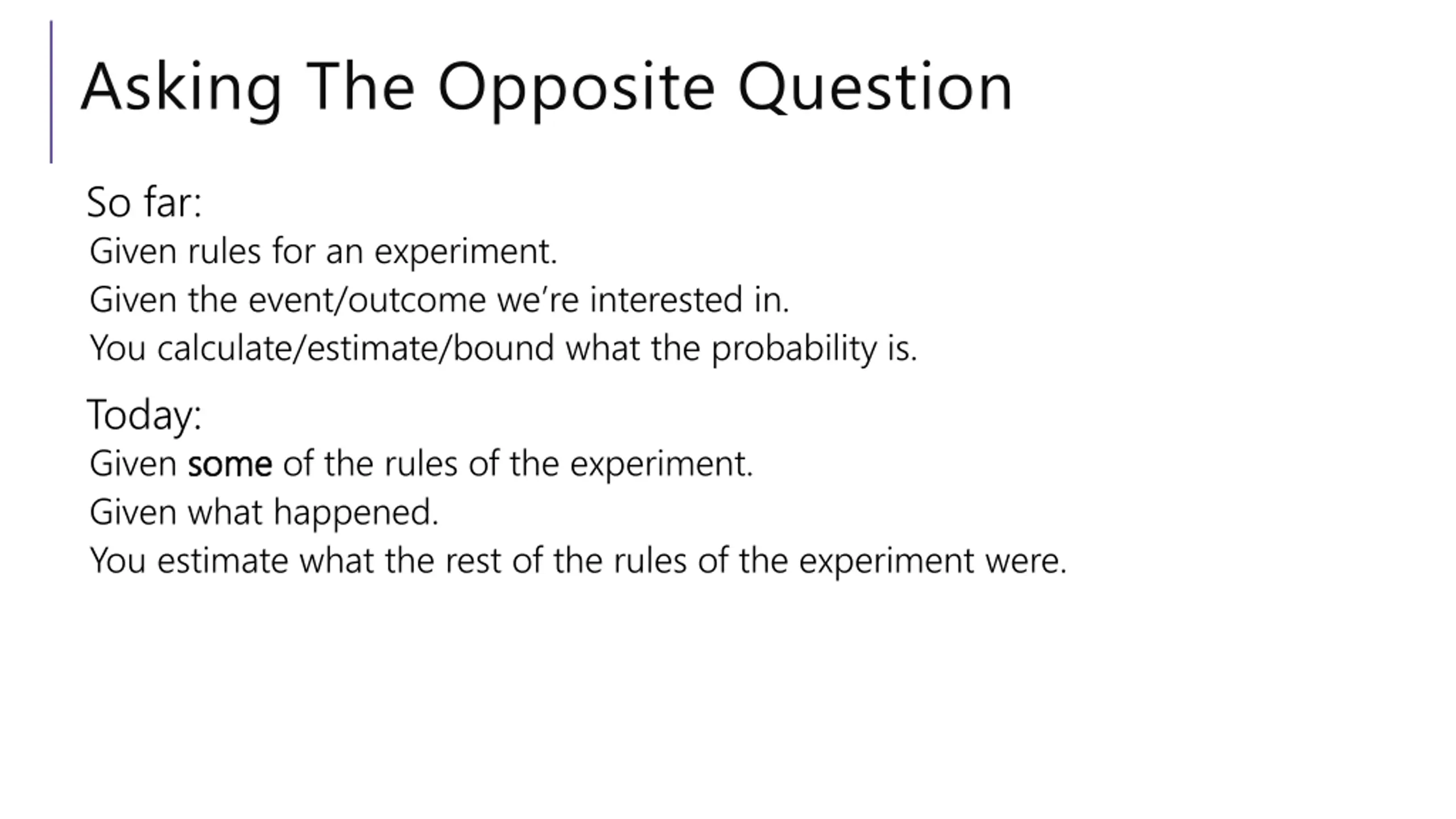 Asking The Opposite Question So far: Given rules for an experiment. Given the event/outcome we re interested in. You calculate/estimate/bound what the probability is. Today: Given some some of the rules of the experiment. Given what happened. You estimate what the rest of the rules of the experiment were.