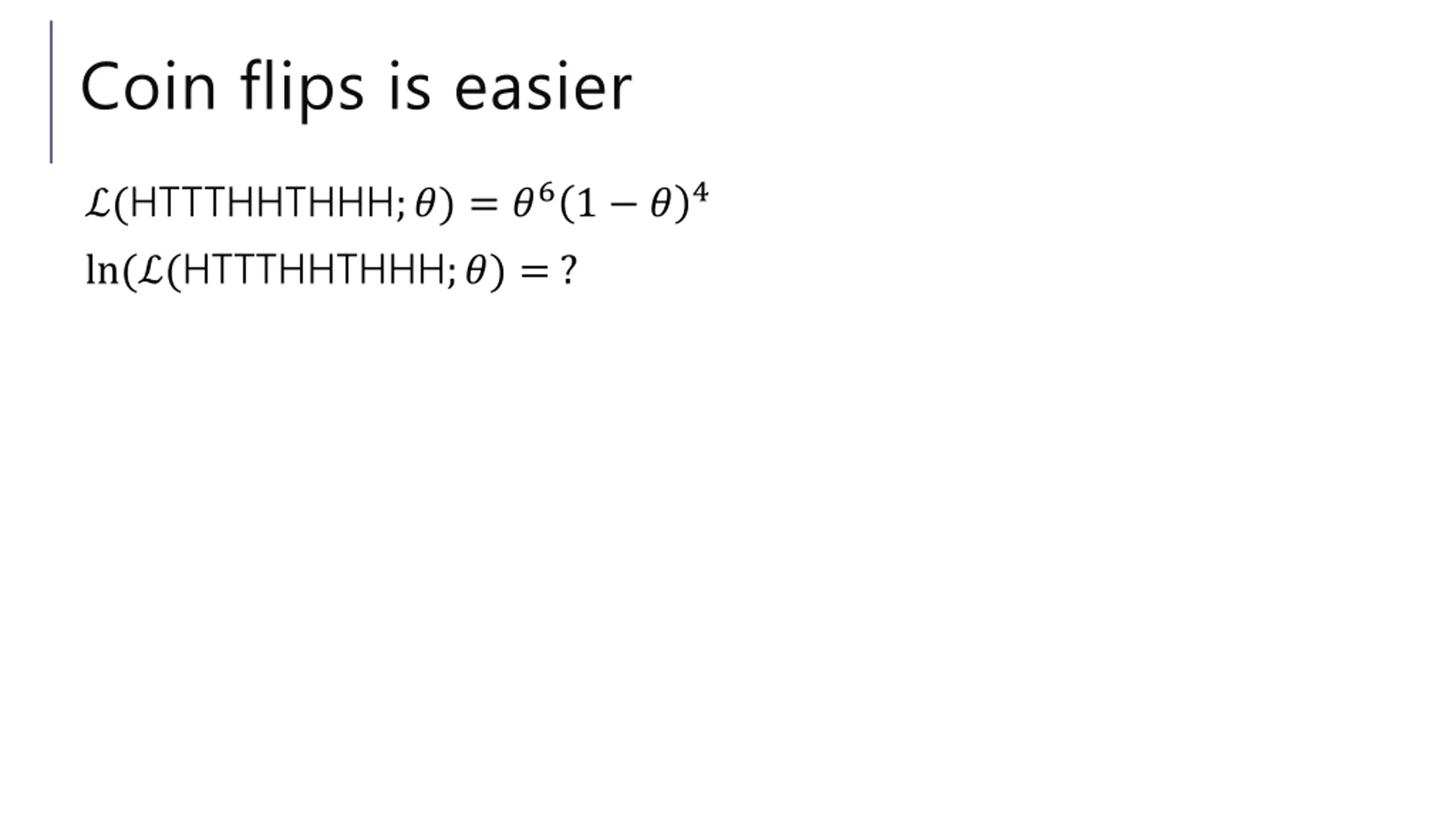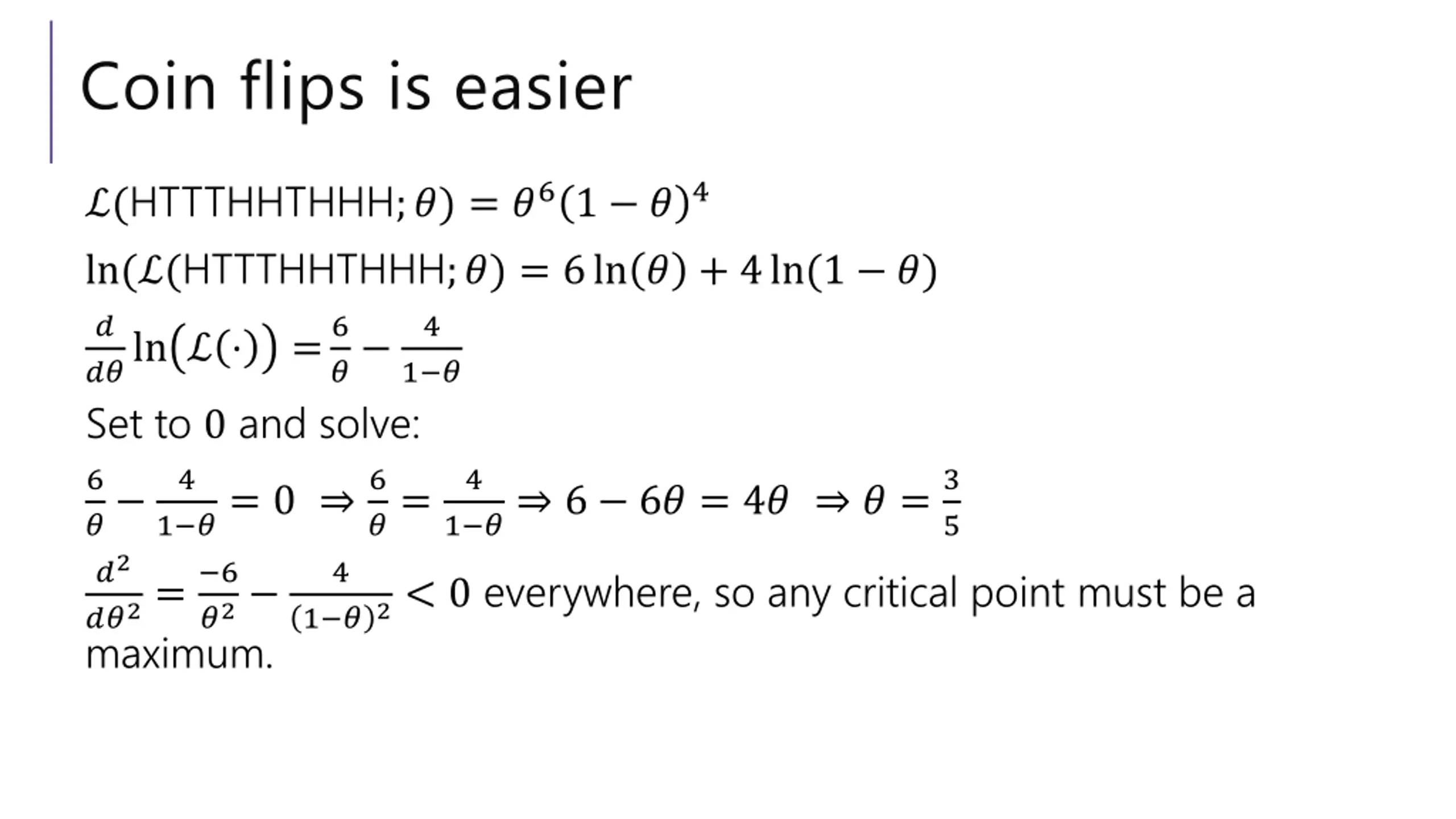 Coin flips is easier (HTTTHHTHHH;?) = ?61 ?4 ln( (HTTTHHTHHH;?) = 6ln ? + 4ln(1 ?) =6 ? 1 ? Set to 0 and solve: ? ??ln 4 6 ? ?2 ??2= 6 maximum. 4 6 ?= 1 ? 6 6? = 4? ? =3 4 1 ?= 0 5 4 1 ?2< 0 everywhere, so any critical point must be a ?2