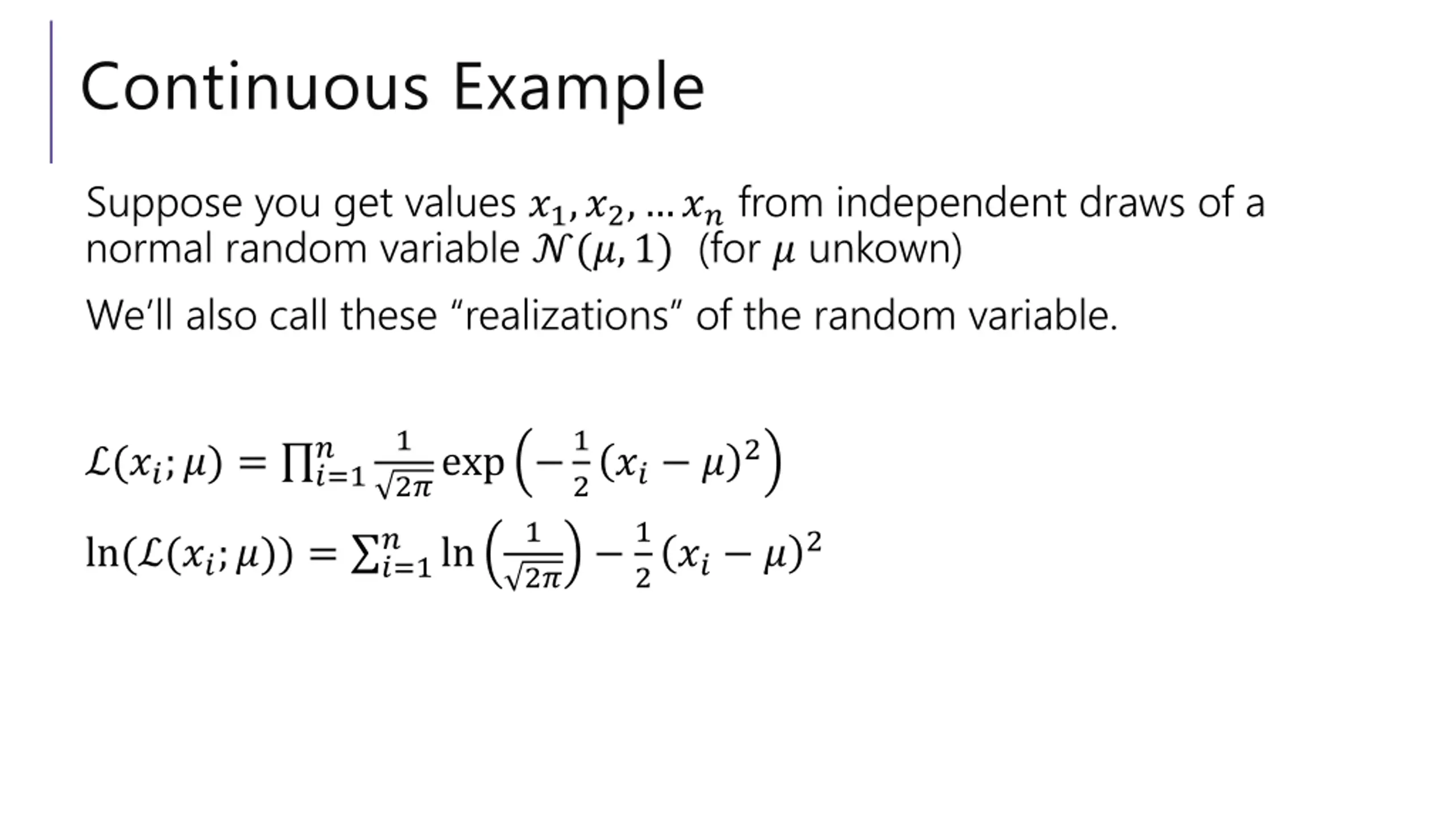 Continuous Example Suppose you get values ?1,?2, ?? from independent draws of a normal random variable ?(?,1) (for ? unkown) We ll also call these realizations of the random variable. 1 2?exp 1 ? 2?? ?2 2? 1 (??;?) = ?=1 1 ? 2?? ?2 ln( (??;?)) = ?=1 ln