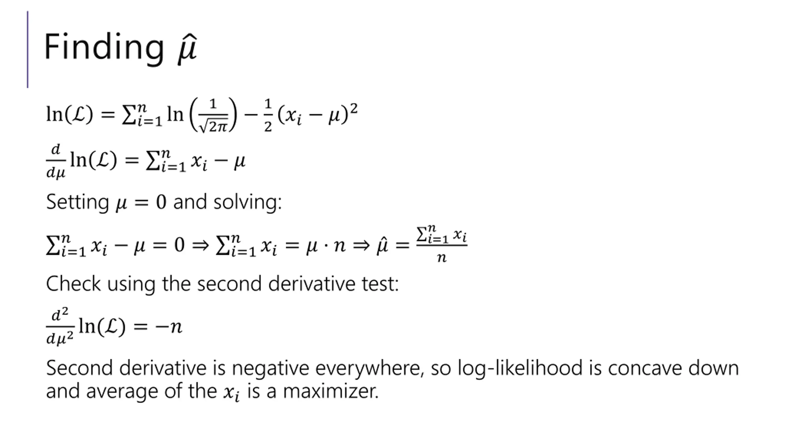 Finding ? 1 2? 1 ? 2?? ?2 ln = ?=1 ln ? ??ln = ?=1 Setting ? = 0 and solving: ? ?? ? ? ?=1 ?? ? ? ?=1 Check using the second derivative test: ?? ? = 0 ?=1 ??= ? ? ? = ? ?2 ??2ln( ) = ? Second derivative is negative everywhere, so log-likelihood is concave down and average of the ?? is a maximizer.