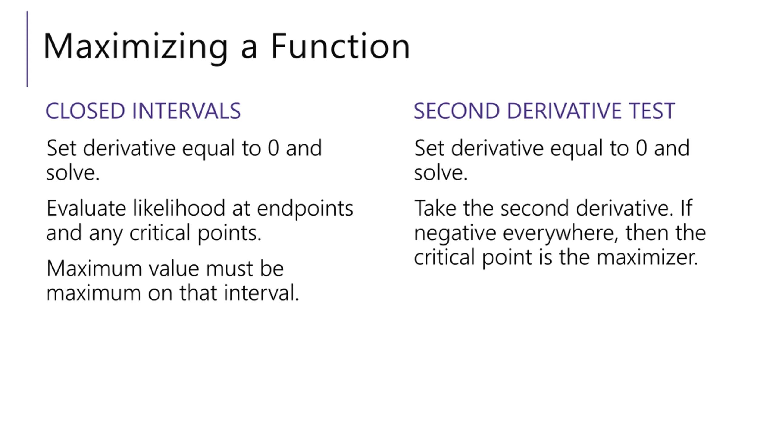 Maximizing a Function CLOSED INTERVALS Set derivative equal to 0 and solve. Evaluate likelihood at endpoints and any critical points. Maximum value must be maximum on that interval. SECOND DERIVATIVE TEST Set derivative equal to 0 and solve. Take the second derivative. If negative everywhere, then the critical point is the maximizer.