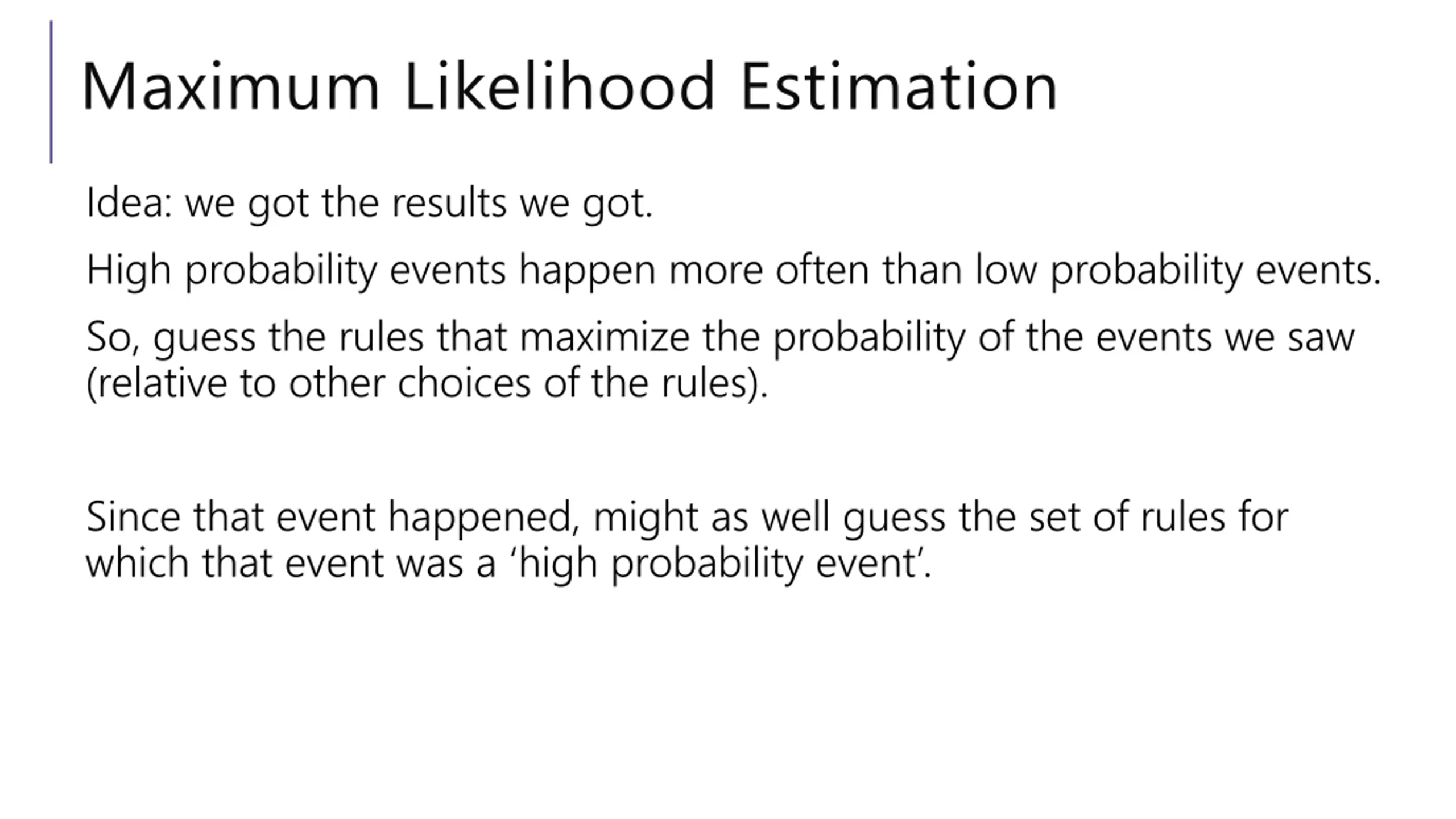Maximum Likelihood Estimation Idea: we got the results we got. High probability events happen more often than low probability events. So, guess the rules that maximize the probability of the events we saw (relative to other choices of the rules). Since that event happened, might as well guess the set of rules for which that event was a high probability event .