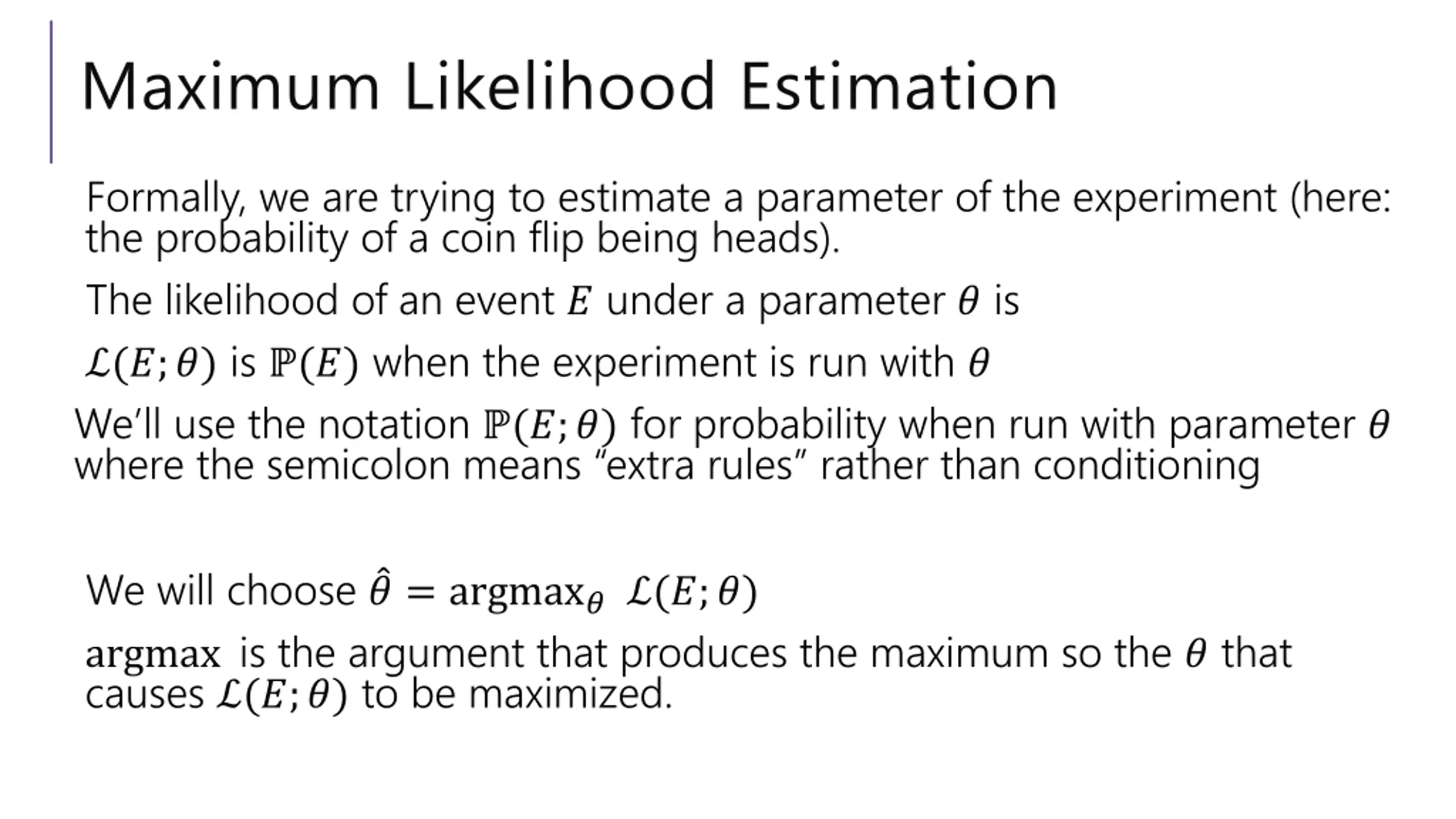 Maximum Likelihood Estimation Formally, we are trying to estimate a parameter of the experiment (here: the probability of a coin flip being heads). The likelihood of an event ? under a parameter ? is (?;?) is (?) when the experiment is run with ? We ll use the notation (?;?) for probability when run with parameter ? where the semicolon means extra rules rather than conditioning We will choose ? = argmax? (?;?) argmax is the argument that produces the maximum so the ? that causes (?;?) to be maximized.