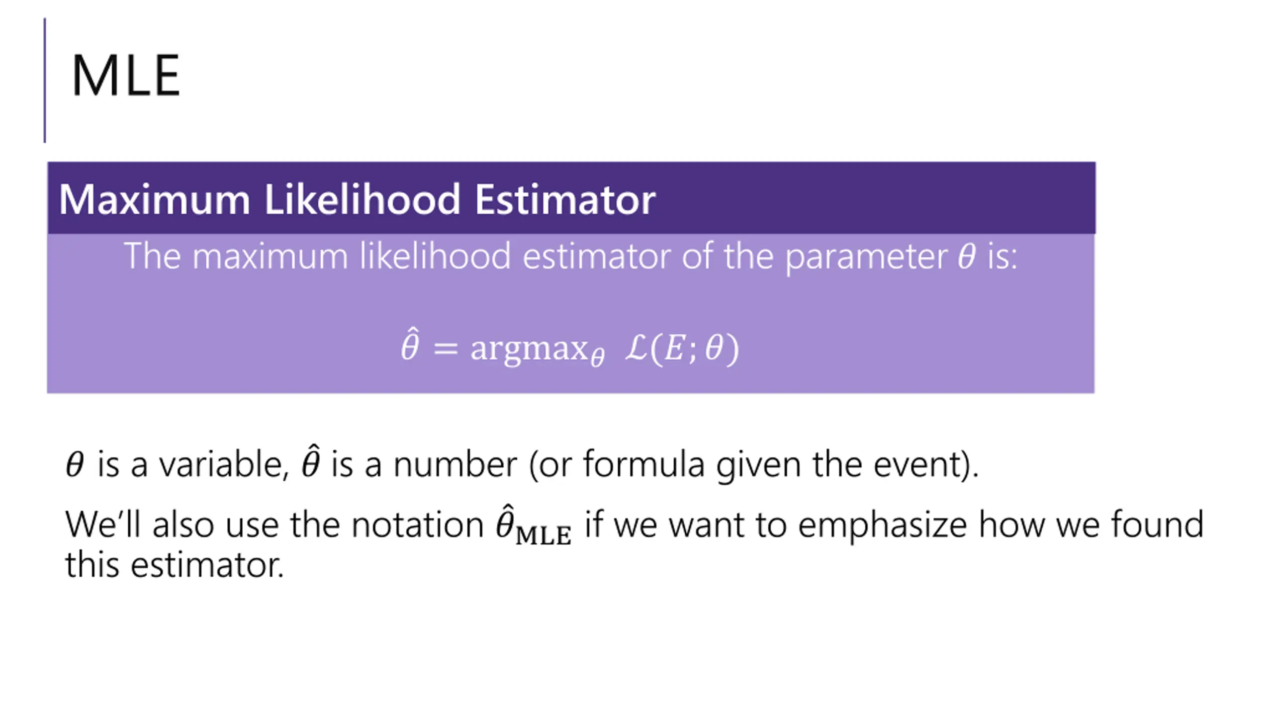 MLE Maximum Likelihood Estimator The maximum likelihood estimator of the parameter?is: ? = argmax? (?;?) ? is a variable, ? is a number (or formula given the event). We ll also use the notation ?MLE if we want to emphasize how we found this estimator.