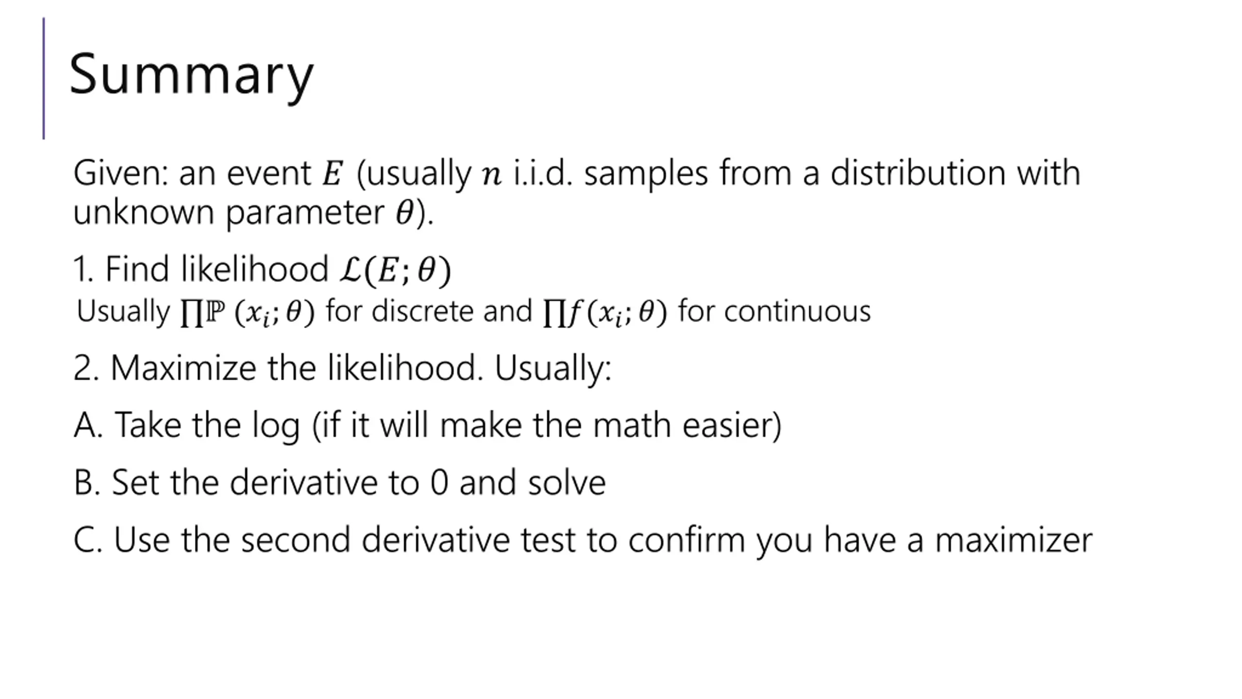 Summary Given: an event ? (usually ? i.i.d. samples from a distribution with unknown parameter ?). 1. Find likelihood (?;?) Usually (??;?) for discrete and ?(??;?) for continuous 2. Maximize the likelihood. Usually: A. Take the log (if it will make the math easier) B. Set the derivative to 0 and solve C. Use the second derivative test to confirm you have a maximizer