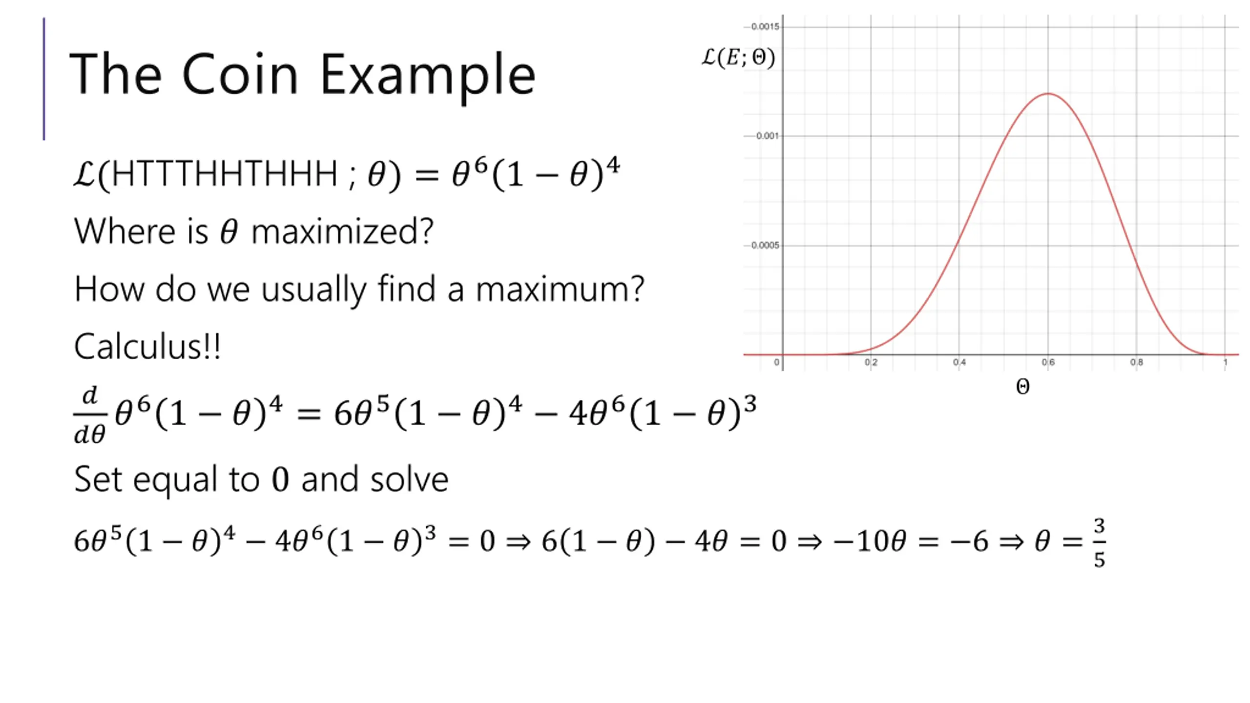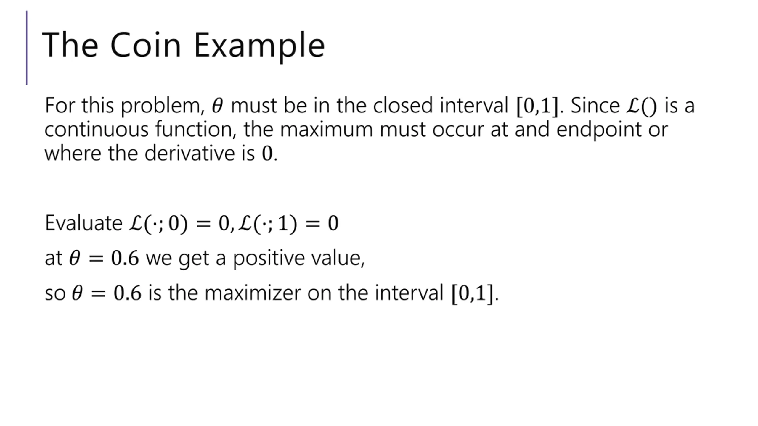 The Coin Example For this problem, ? must be in the closed interval [0,1]. Since () is a continuous function, the maximum must occur at and endpoint or where the derivative is 0. Evaluate ( ;0) = 0, ( ;1) = 0 at ? = 0.6 we get a positive value, so ? = 0.6 is the maximizer on the interval [0,1].