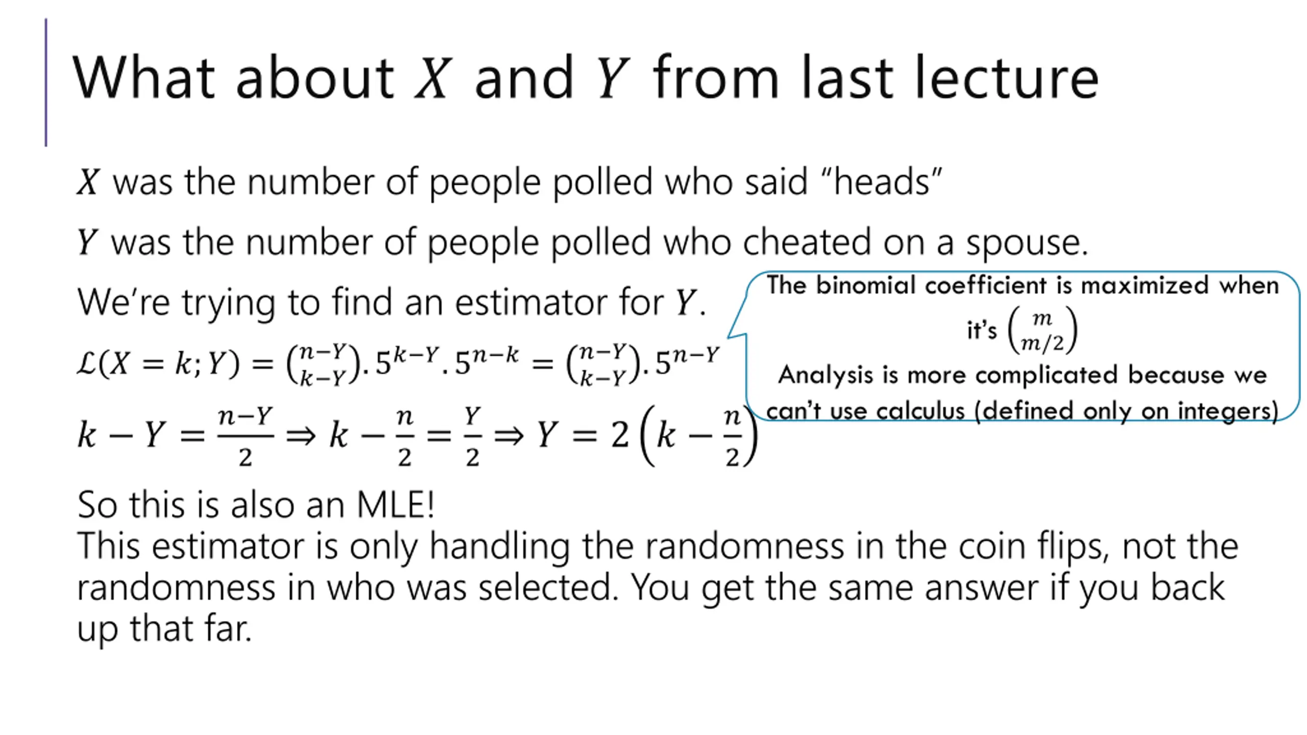 What about ? and ? from last lecture ?was the number of people polled who said heads ? was the number of people polled who cheated on a spouse. We re trying to find an estimator for ?. The binomial coefficient is maximized when it s ?/2 Analysis is more complicated because we can t use calculus (defined only on integers) ? ? ? ? ?.5? ?.5? ?= ? ? ? ? ? ?.5? ? ? = ?;? = ? ? =? ? 2=? 2 ? = 2 ? ? 2 2 So this is also an MLE! This estimator is only handling the randomness in the coin flips, not the randomness in who was selected. You get the same answer if you back up that far.