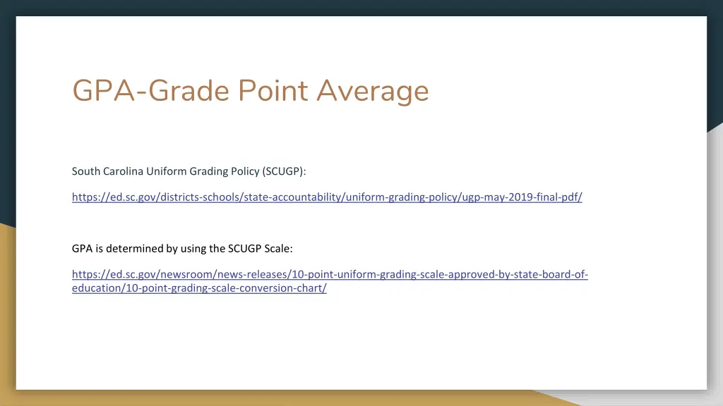 GPA-Grade Point Average South Carolina Uniform Grading Policy (SCUGP): https://ed.sc.gov/districts-schools/state-accountability/uniform-grading-policy/ugp-may-2019-final-pdf/ GPA is determined by using the SCUGP Scale: https://ed.sc.gov/newsroom/news-releases/10-point-uniform-grading-scale-approved-by-state-board-of- education/10-point-grading-scale-conversion-chart/