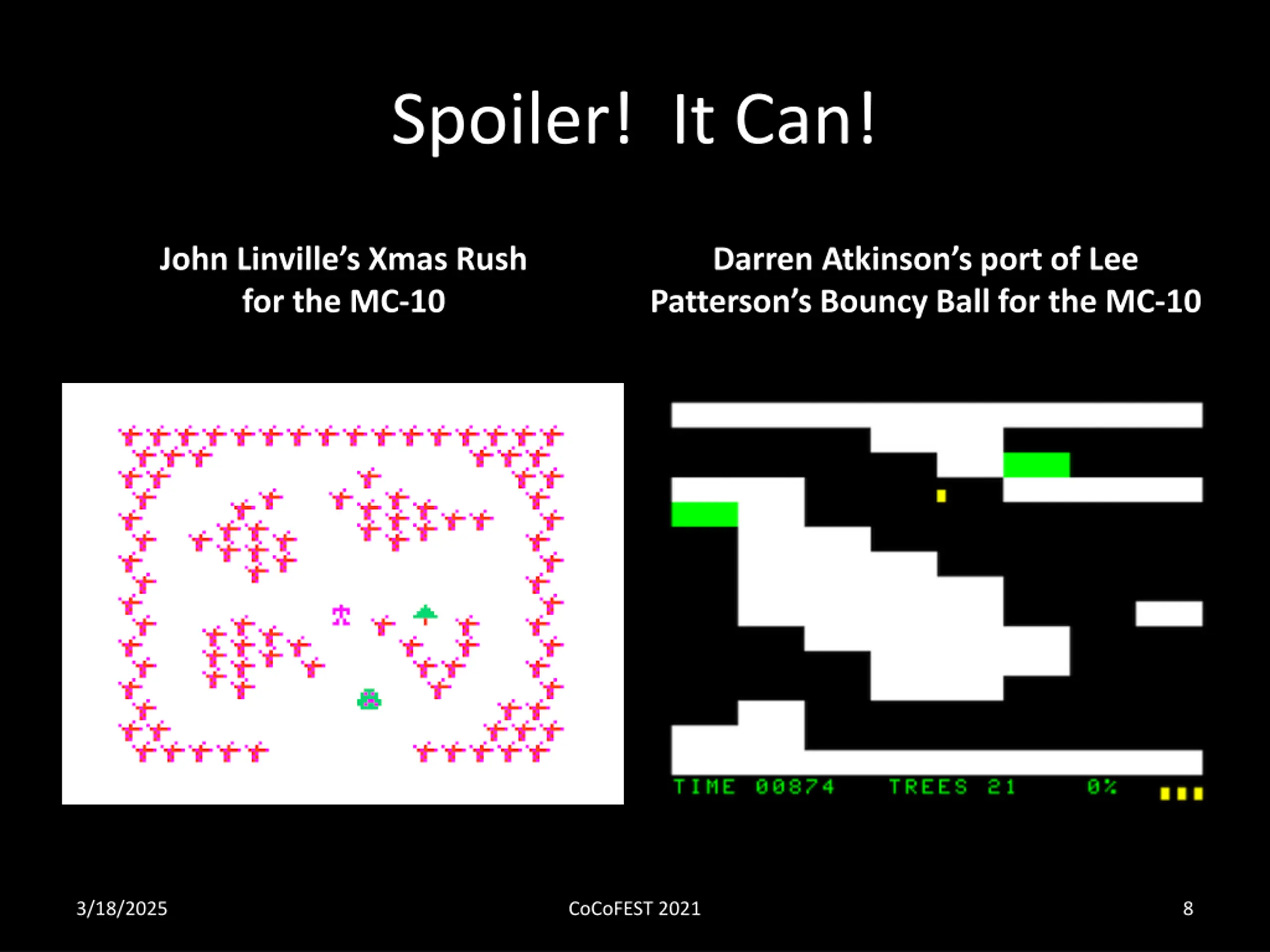 Spoiler! It Can! John Linville s Xmas Rush for the MC-10 Darren Atkinson s port of Lee Patterson s Bouncy Ball for the MC-10 3/18/2025 CoCoFEST 2021 8