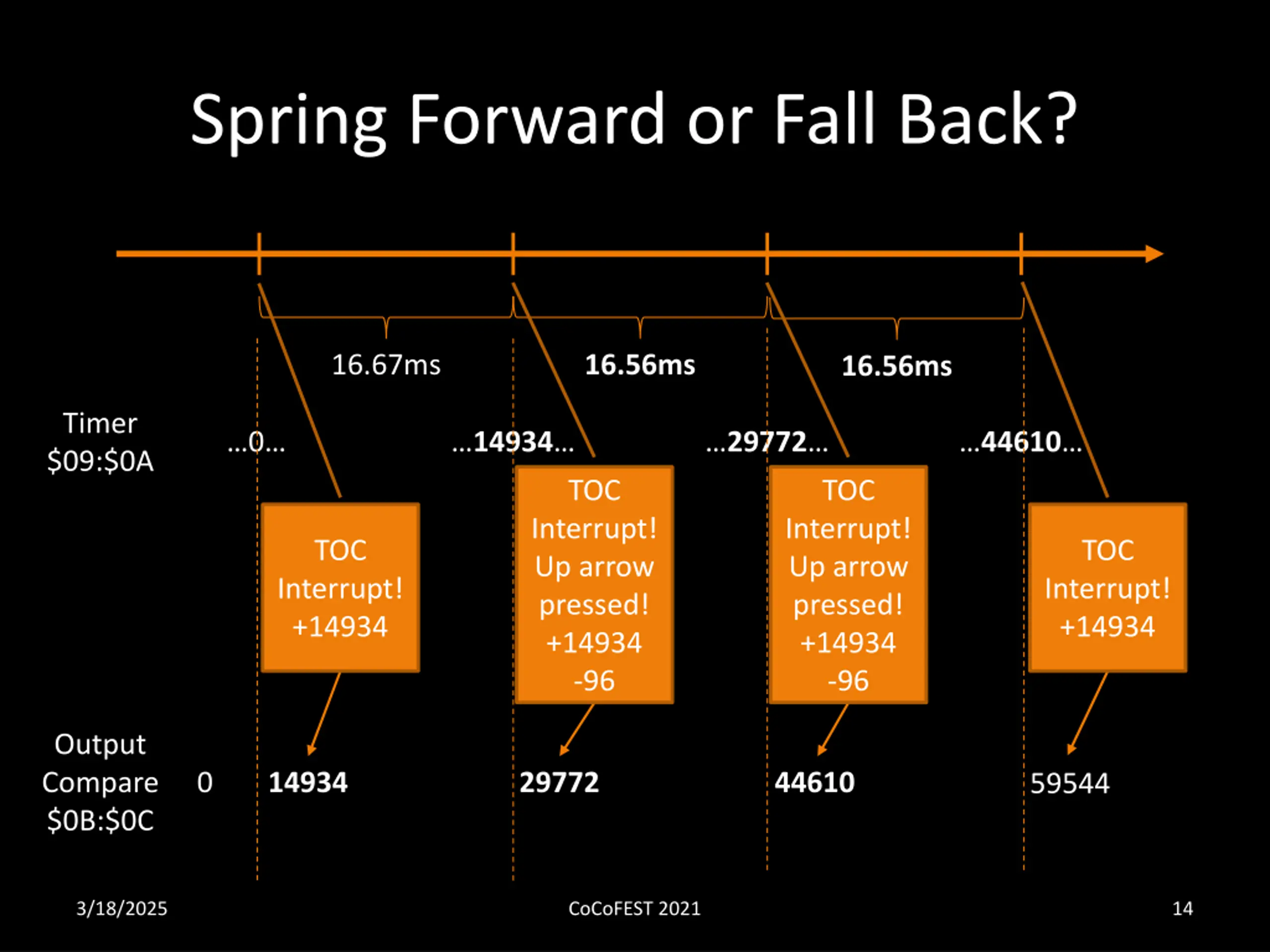 Spring Forward or Fall Back? 16.67ms 16.56ms 16.56ms Timer $09:$0A 0 14934 29772 44610 TOC TOC Interrupt! Up arrow pressed! +14934 -96 Interrupt! Up arrow pressed! +14934 -96 TOC TOC Interrupt! +14934 Interrupt! +14934 Output Compare $0B:$0C 0 14934 29772 44610 59544 3/18/2025 CoCoFEST 2021 14
