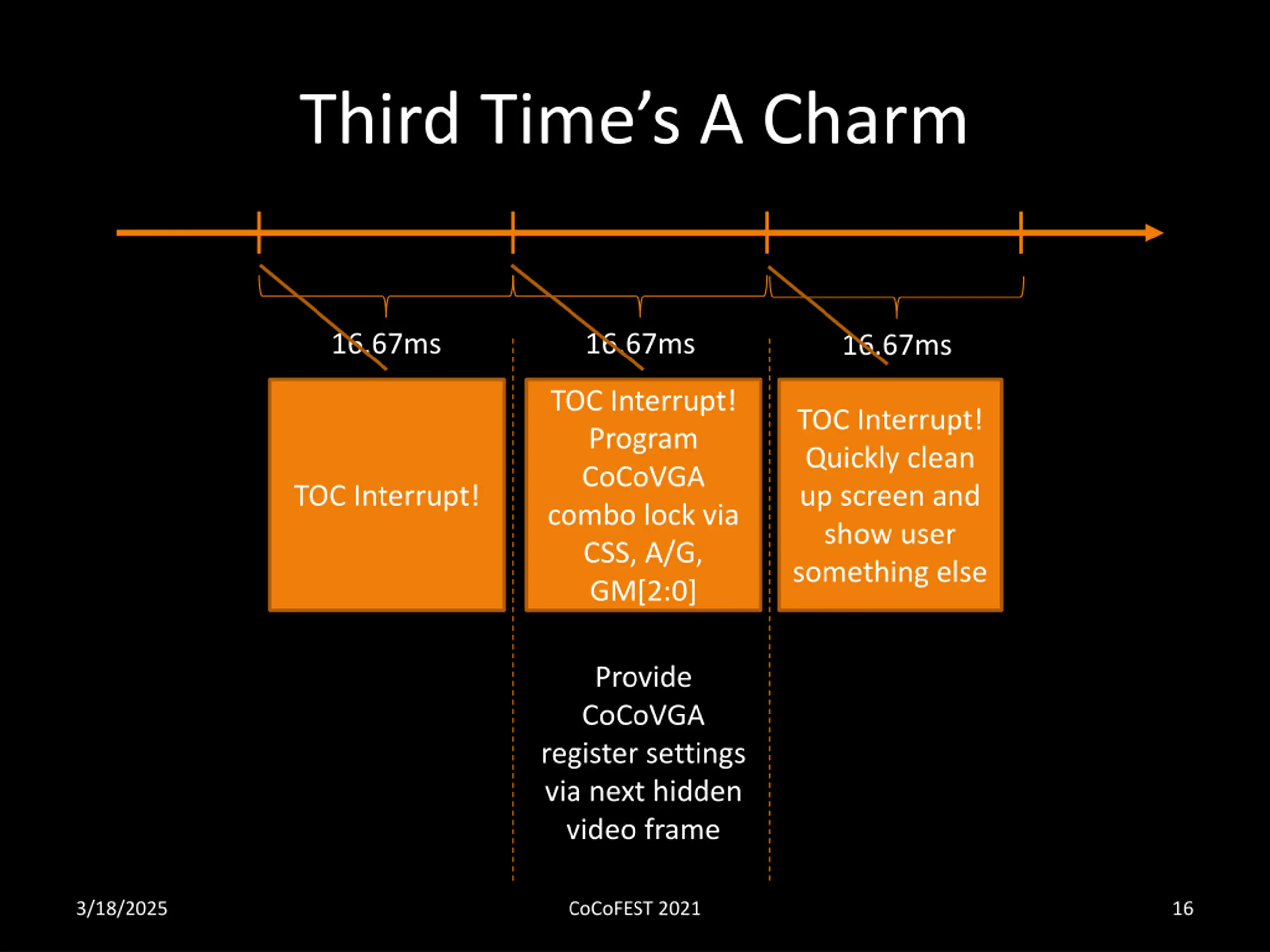 Third Times A Charm 16.67ms 16.67ms 16.67ms TOC Interrupt! Program CoCoVGA combo lock via CSS, A/G, GM[2:0] TOC Interrupt! Quickly clean up screen and show user something else TOC Interrupt! Provide CoCoVGA register settings via next hidden video frame 3/18/2025 CoCoFEST 2021 16