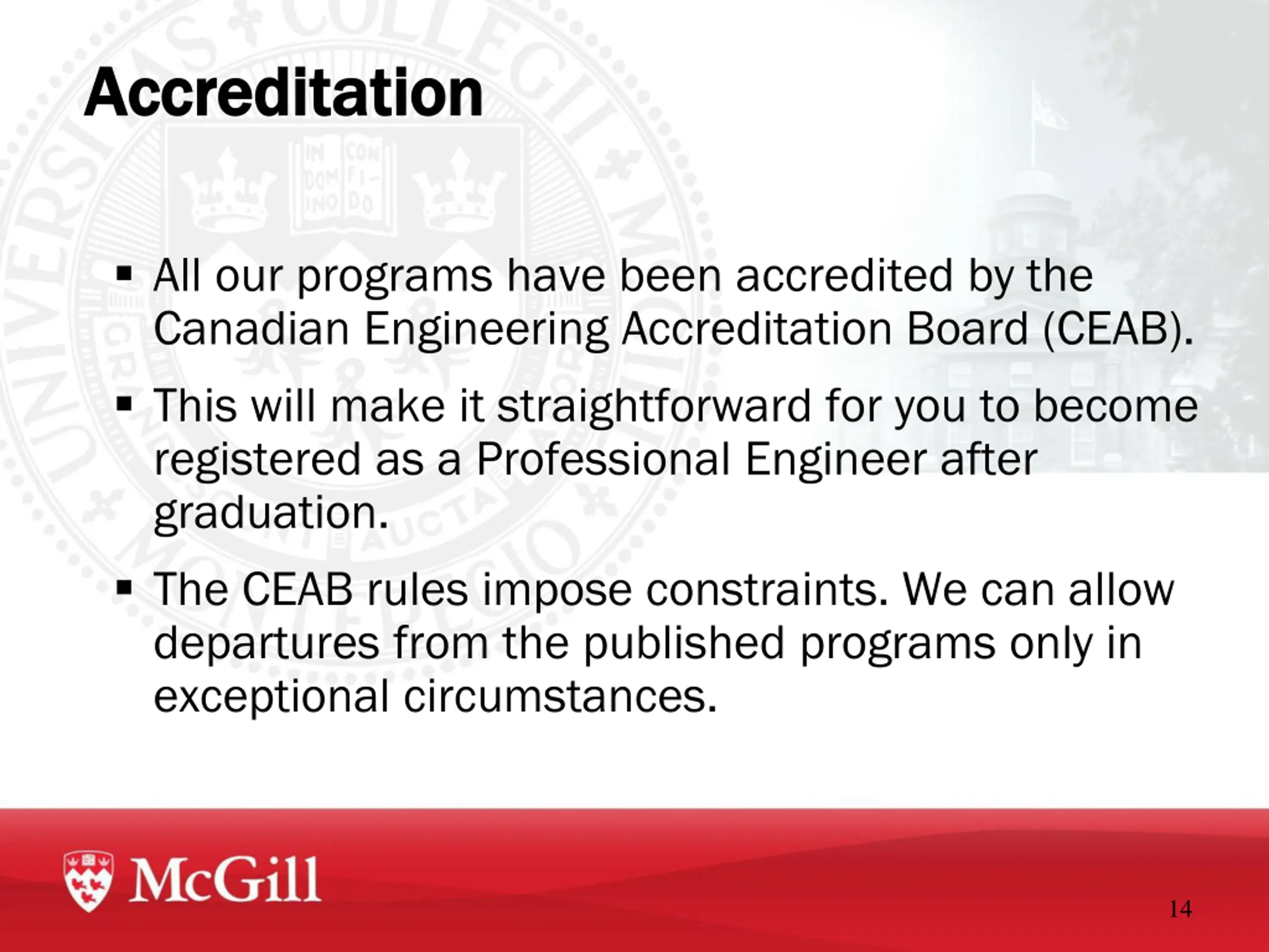 Accreditation Accreditation All our programs have been accredited by the Canadian Engineering Accreditation Board (CEAB). This will make it straightforward for you to become registered as a Professional Engineer after graduation. The CEAB rules impose constraints. We can allow departures from the published programs only in exceptional circumstances. 14