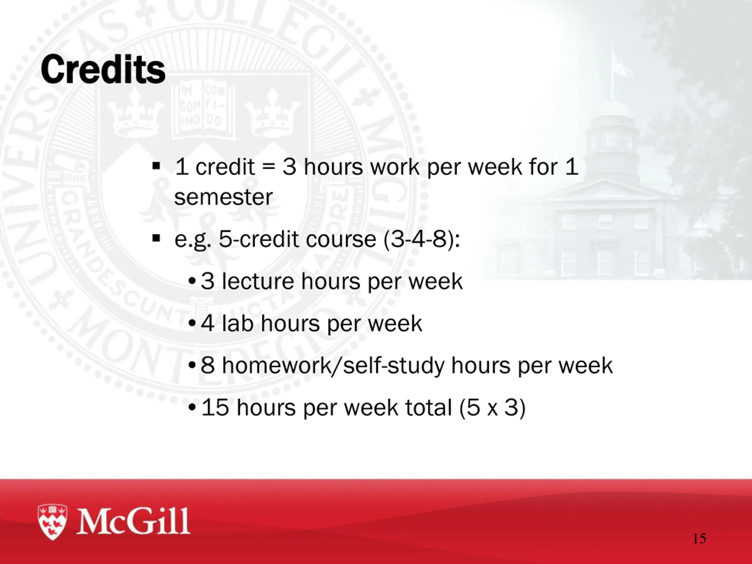 Credits Credits 1 credit = 3 hours work per week for 1 semester e.g. 5-credit course (3-4-8): 3 lecture hours per week 4 lab hours per week 8 homework/self-study hours per week 15 hours per week total (5 x 3) 15