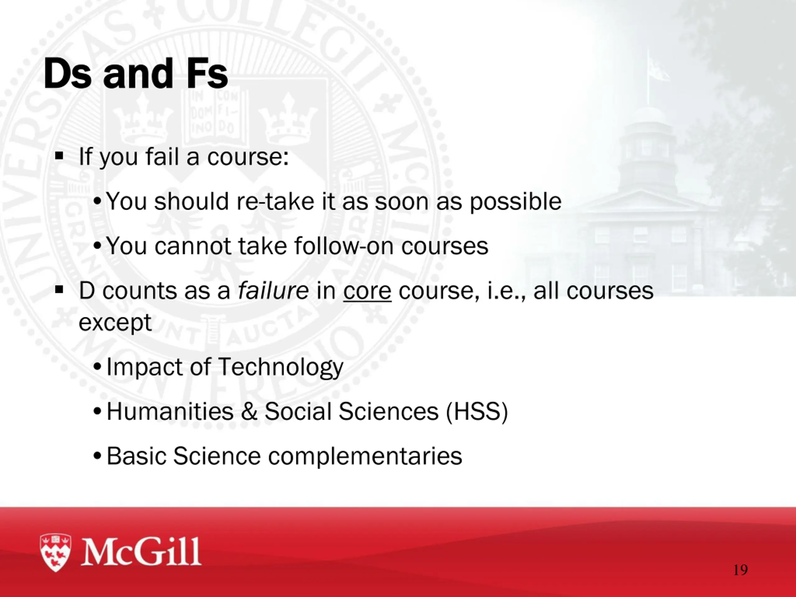 Ds and Fs Ds and Fs If you fail a course: You should re-take it as soon as possible You cannot take follow-on courses D counts as a failure in core course, i.e., all courses except Impact of Technology Humanities & Social Sciences (HSS) Basic Science complementaries 19