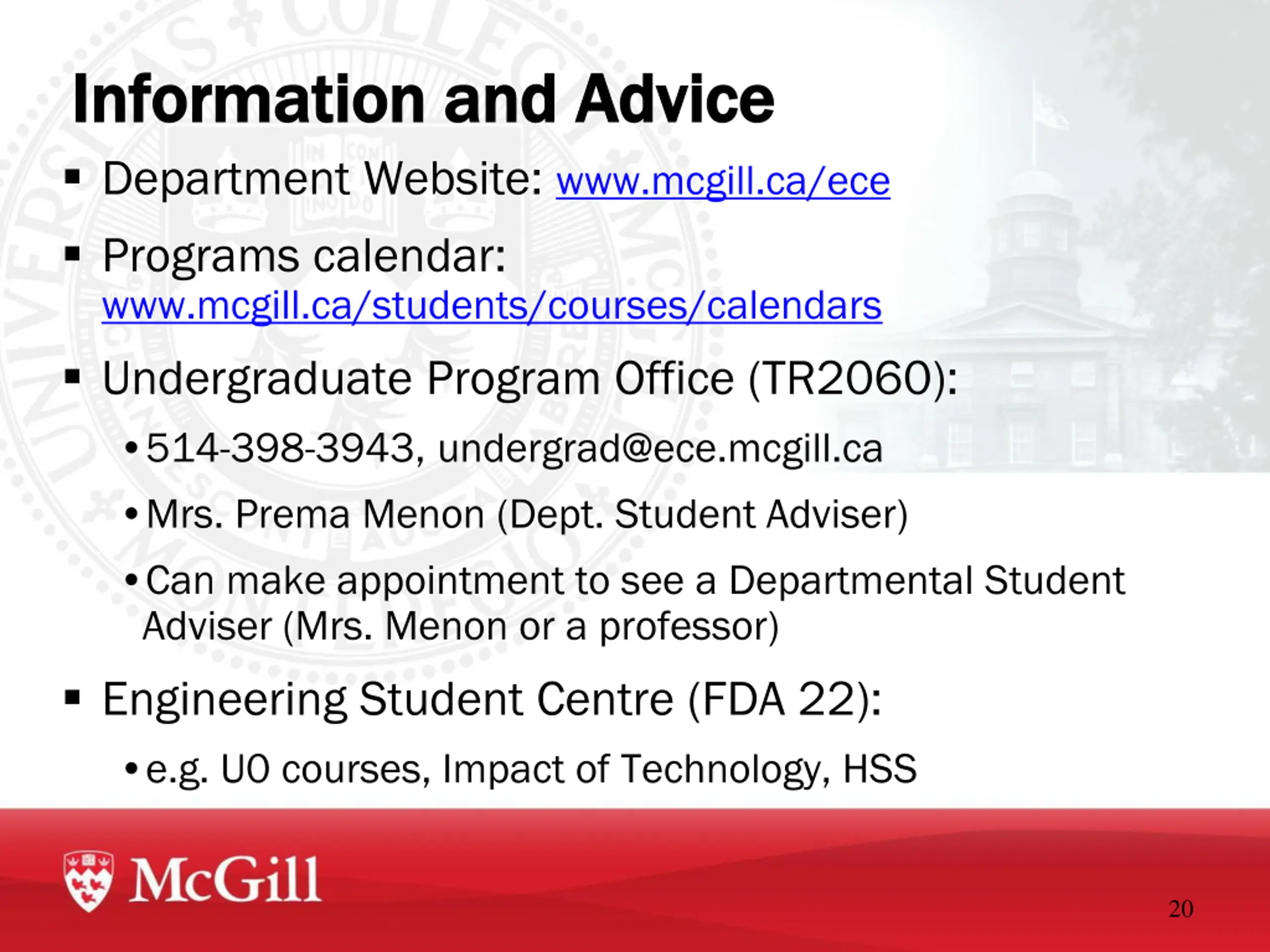 Information and Advice Information and Advice Department Website: www.mcgill.ca/ece Programs calendar: www.mcgill.ca/students/courses/calendars Undergraduate Program Office (TR2060): 514-398-3943, undergrad@ece.mcgill.ca Mrs. Prema Menon (Dept. Student Adviser) Can make appointment to see a Departmental Student Adviser (Mrs. Menon or a professor) Engineering Student Centre (FDA 22): e.g. U0 courses, Impact of Technology, HSS 20