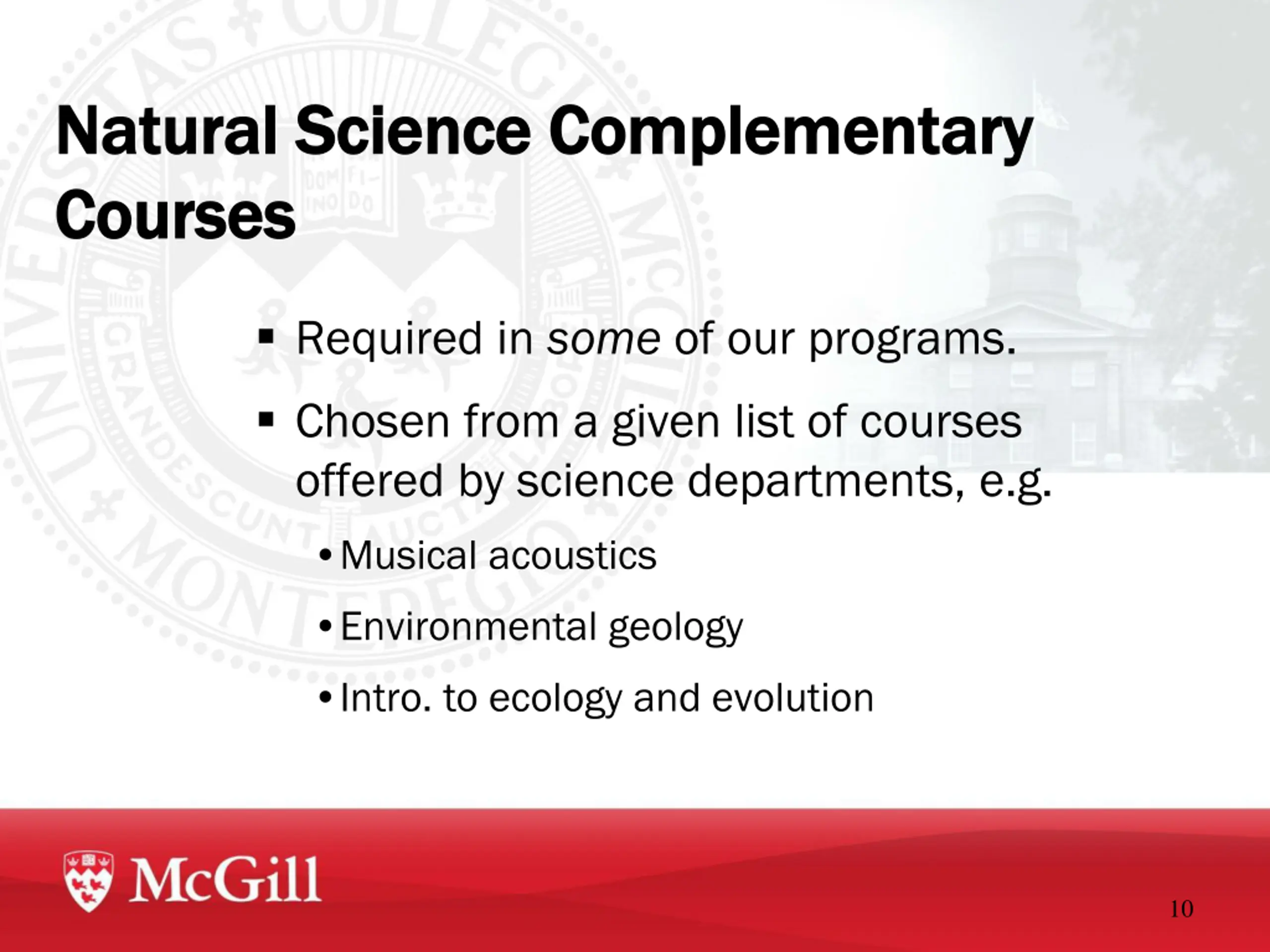 Natural Science Complementary Natural Science Complementary Courses Courses Required in some of our programs. Chosen from a given list of courses offered by science departments, e.g. Musical acoustics Environmental geology Intro. to ecology and evolution 10