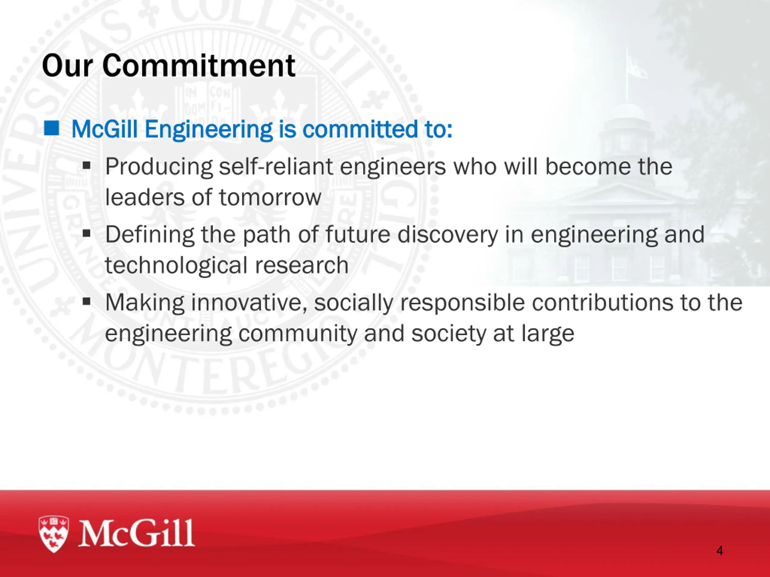 Our Commitment McGill Engineering is committed to: McGill Engineering is committed to: Producing self-reliant engineers who will become the leaders of tomorrow Defining the path of future discovery in engineering and technological research Making innovative, socially responsible contributions to the engineering community and society at large 4