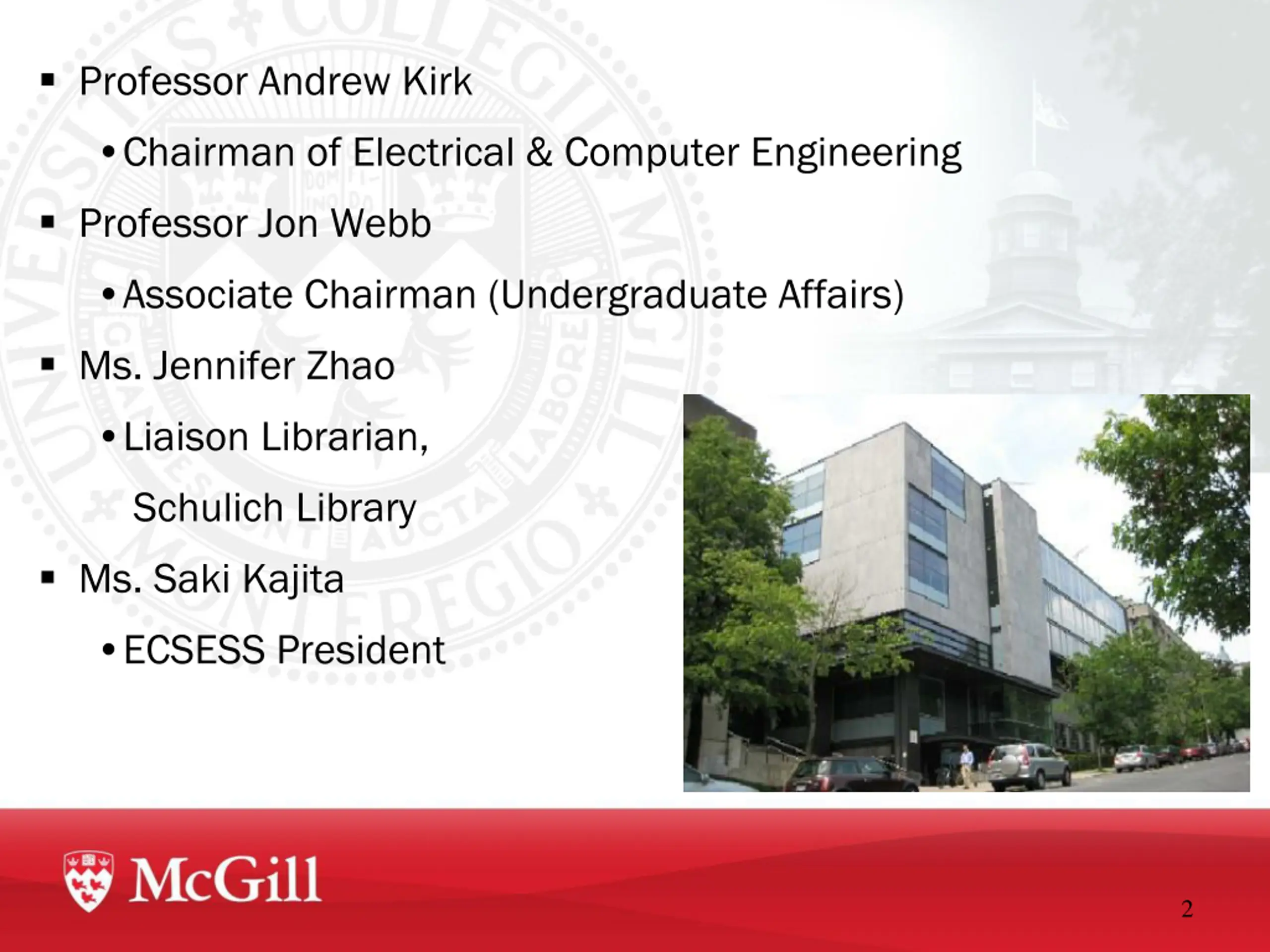 Professor Andrew Kirk Chairman of Electrical & Computer Engineering Professor Jon Webb Associate Chairman (Undergraduate Affairs) Ms. Jennifer Zhao Liaison Librarian, Schulich Library Ms. Saki Kajita ECSESS President 2