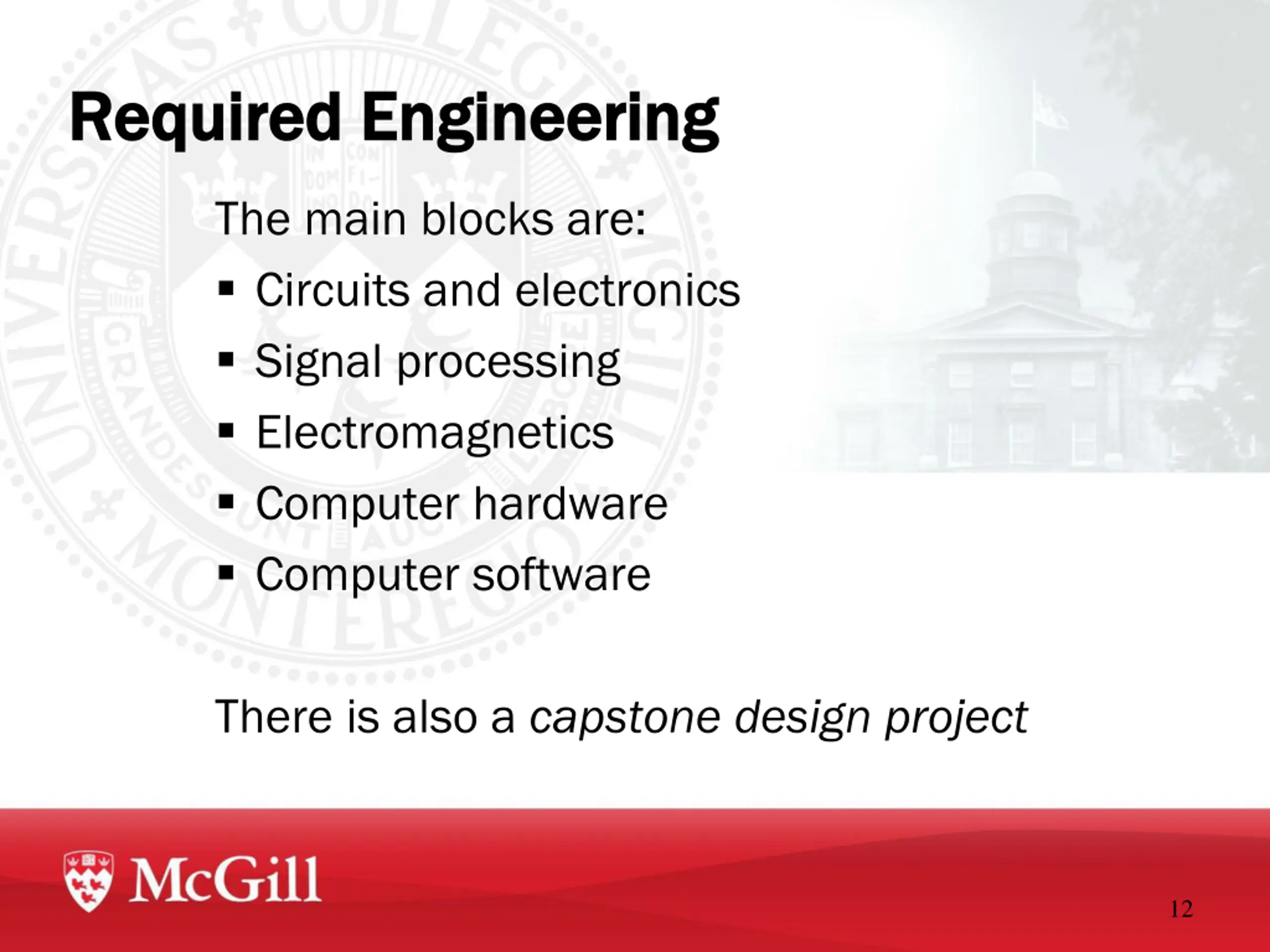 Required Engineering Required Engineering The main blocks are: Circuits and electronics Signal processing Electromagnetics Computer hardware Computer software There is also a capstone design project 12