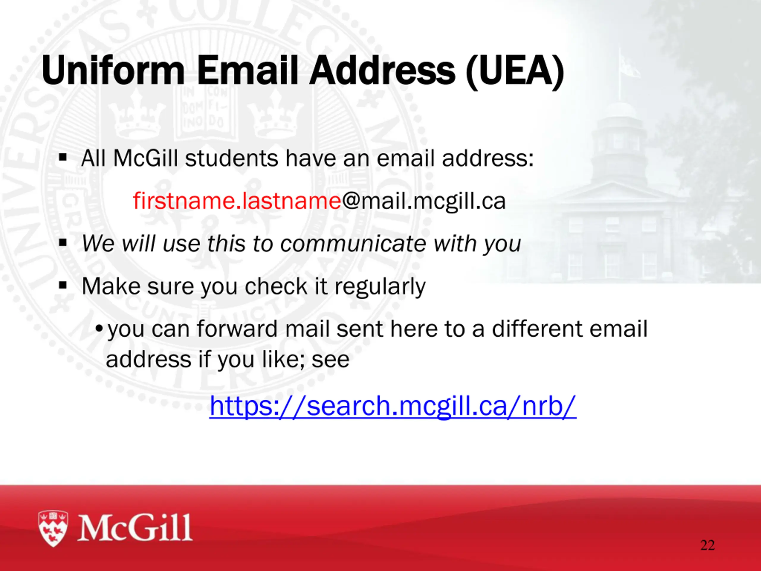Uniform Email Address (UEA) Uniform Email Address (UEA) All McGill students have an email address: firstname.lastname@mail.mcgill.ca We will use this to communicate with you Make sure you check it regularly you can forward mail sent here to a different email address if you like; see https://search.mcgill.ca/nrb/ 22