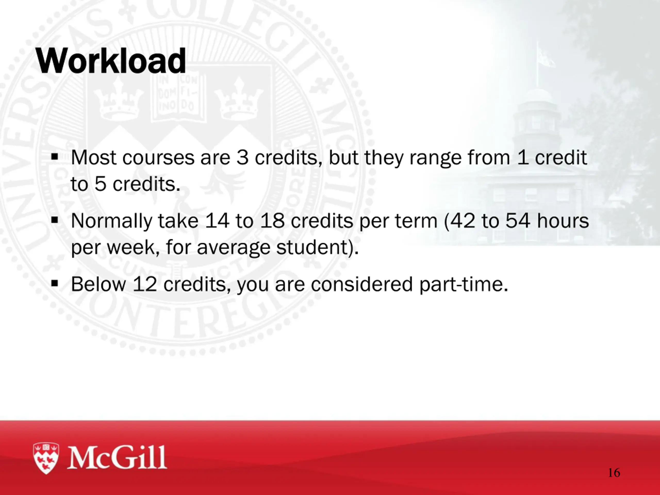 Workload Workload Most courses are 3 credits, but they range from 1 credit to 5 credits. Normally take 14 to 18 credits per term (42 to 54 hours per week, for average student). Below 12 credits, you are considered part-time. 16