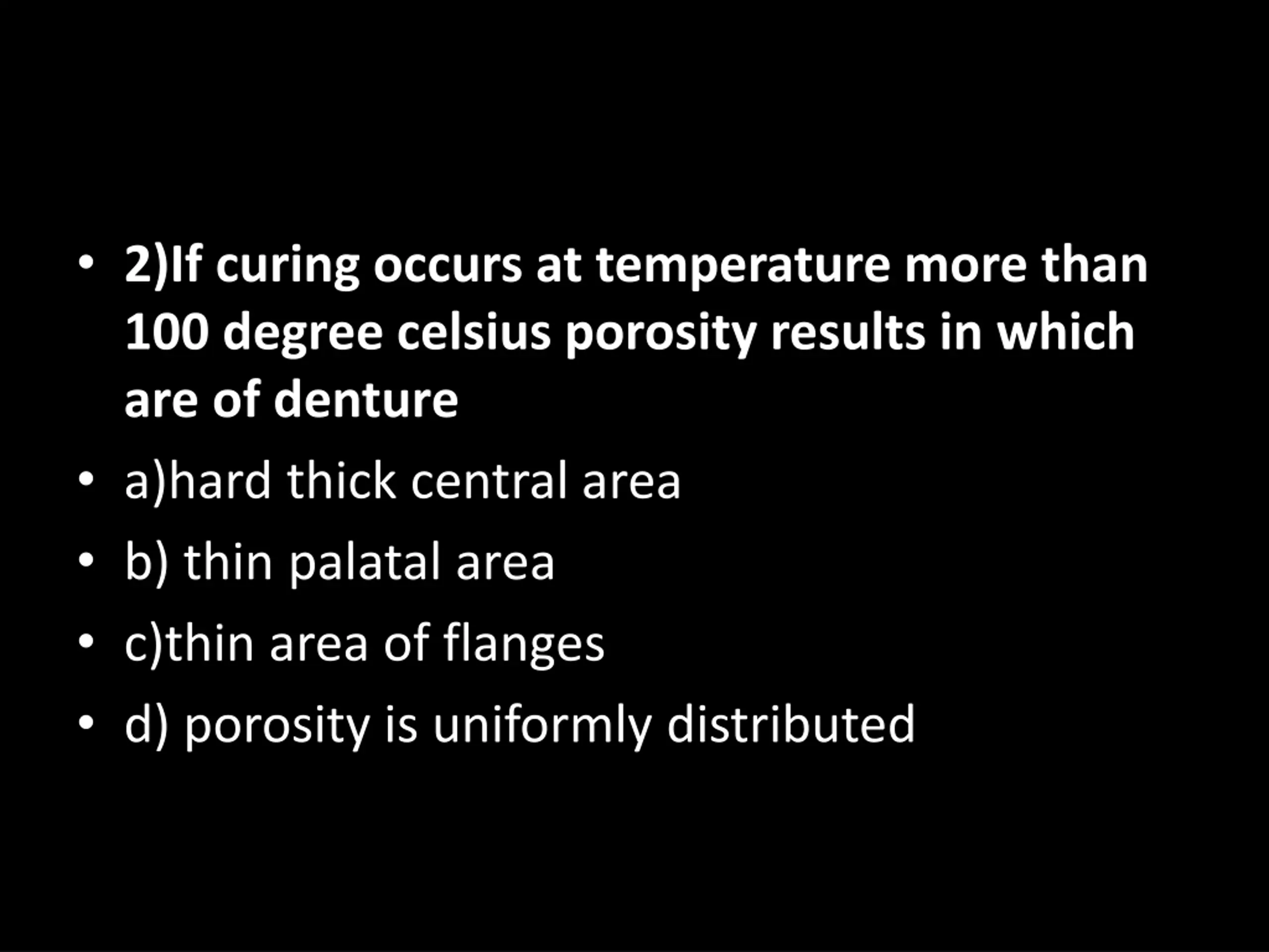 2)If curing occurs at temperature more than 100 degree celsius porosity results in which are of denture a)hard thick central area b) thin palatal area c)thin area of flanges d) porosity is uniformly distributed