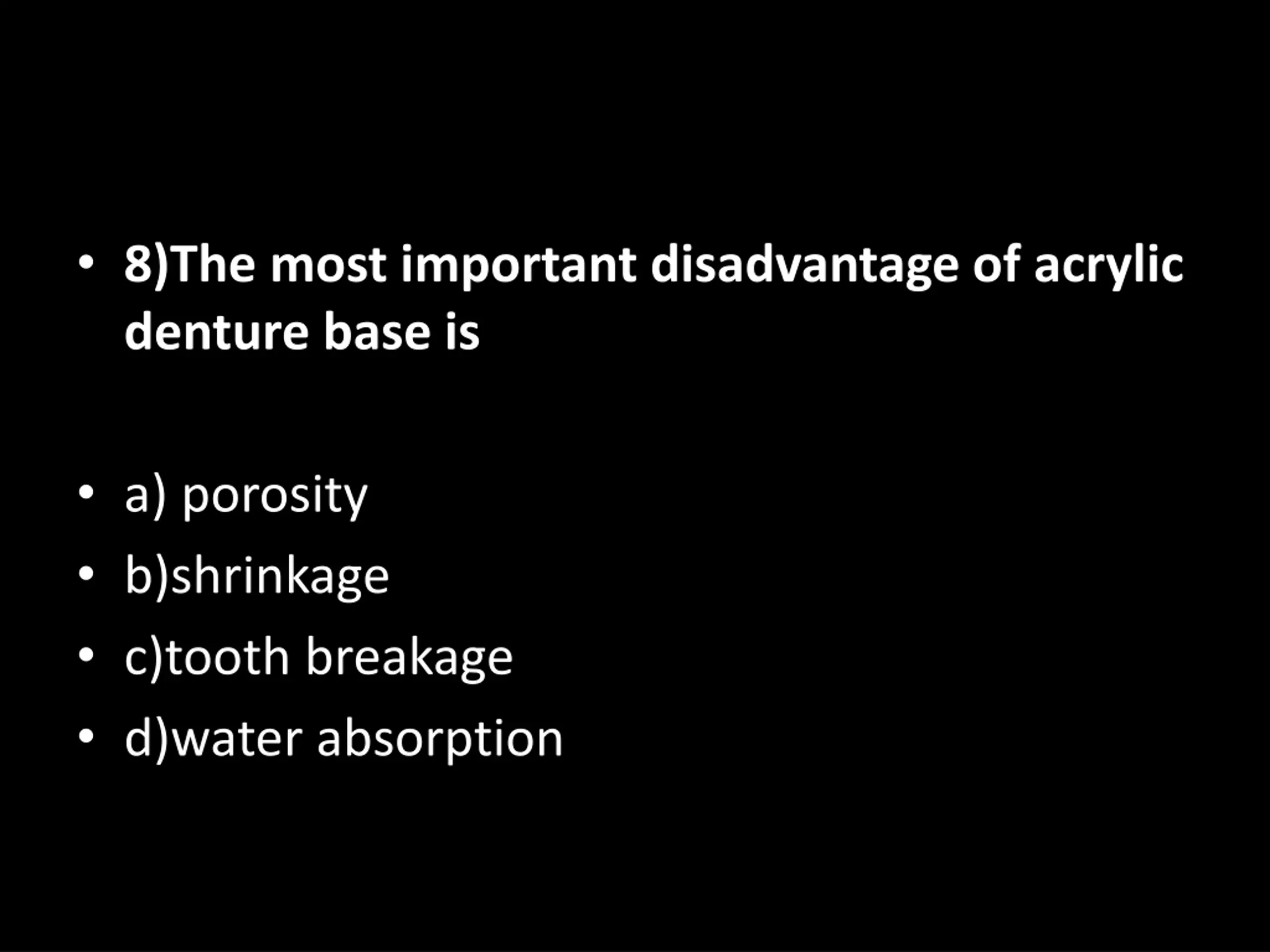 8)The most important disadvantage of acrylic denture base is a) porosity b)shrinkage c)tooth breakage d)water absorption