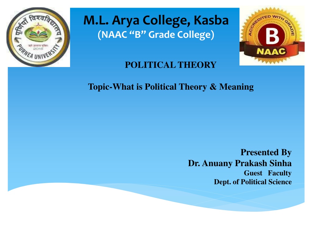 M.L. Arya College, Kasba (NAAC B Grade College) POLITICAL THEORY Topic-What is Political Theory & Meaning Presented By Dr. Anuany Prakash Sinha Guest Faculty Dept. of Political Science