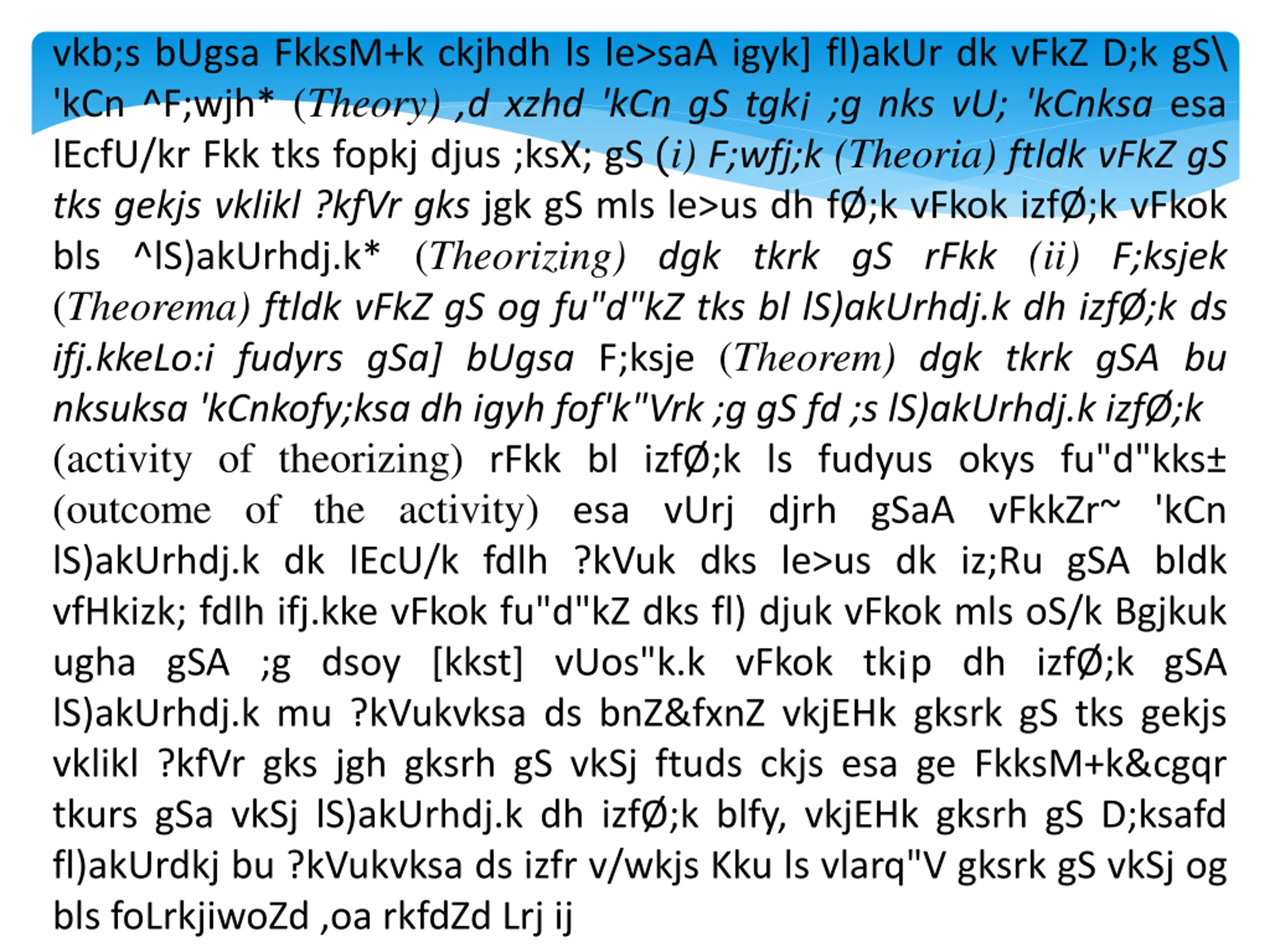 vkb;s bUgsa FkksM+k ckjhdh ls le>saA igyk] fl)akUr dk vFkZ D;k gS\ 'kCn ^F;wjh* (Theory) ,d xzhd 'kCn gS tgk ;g nks vU; 'kCnksa esa lEcfU/kr Fkk tks fopkj djus ;ksX; gS (i) F;wfj;k (Theoria) ftldk vFkZ gS tks gekjs vklikl ?kfVr gks jgk gS mls le>us dh f ;k vFkok izf ;k vFkok bls ^lS)akUrhdj.k* (Theorizing) dgk tkrk gS rFkk (ii) F;ksjek (Theorema) ftldk vFkZ gS og fu"d"kZ tks bl lS)akUrhdj.k dh izf ;k ds ifj.kkeLo:i fudyrs gSa] bUgsa F;ksje (Theorem) dgk tkrk gSA bu nksuksa 'kCnkofy;ksa dh igyh fof'k"Vrk ;g gS fd ;s lS)akUrhdj.k izf ;k (activity of theorizing) rFkk bl izf ;k ls fudyus okys fu"d"kks (outcome of the activity) esa vUrj djrh gSaA vFkkZr~ 'kCn lS)akUrhdj.k dk lEcU/k fdlh ?kVuk dks le>us dk iz;Ru gSA bldk vfHkizk; fdlh ifj.kke vFkok fu"d"kZ dks fl) djuk vFkok mls oS/k Bgjkuk ugha gSA ;g dsoy [kkst] vUos"k.k vFkok tk p dh izf ;k gSA lS)akUrhdj.k mu ?kVukvksa ds bnZ&fxnZ vkjEHk gksrk gS tks gekjs vklikl ?kfVr gks jgh gksrh gS vkSj ftuds ckjs esa ge FkksM+k&cgqr tkurs gSa vkSj lS)akUrhdj.k dh izf ;k blfy, vkjEHk gksrh gS D;ksafd fl)akUrdkj bu ?kVukvksa ds izfr v/wkjs Kku ls vlarq"V gksrk gS vkSj og bls foLrkjiwoZd ,oa rkfdZd Lrj ij