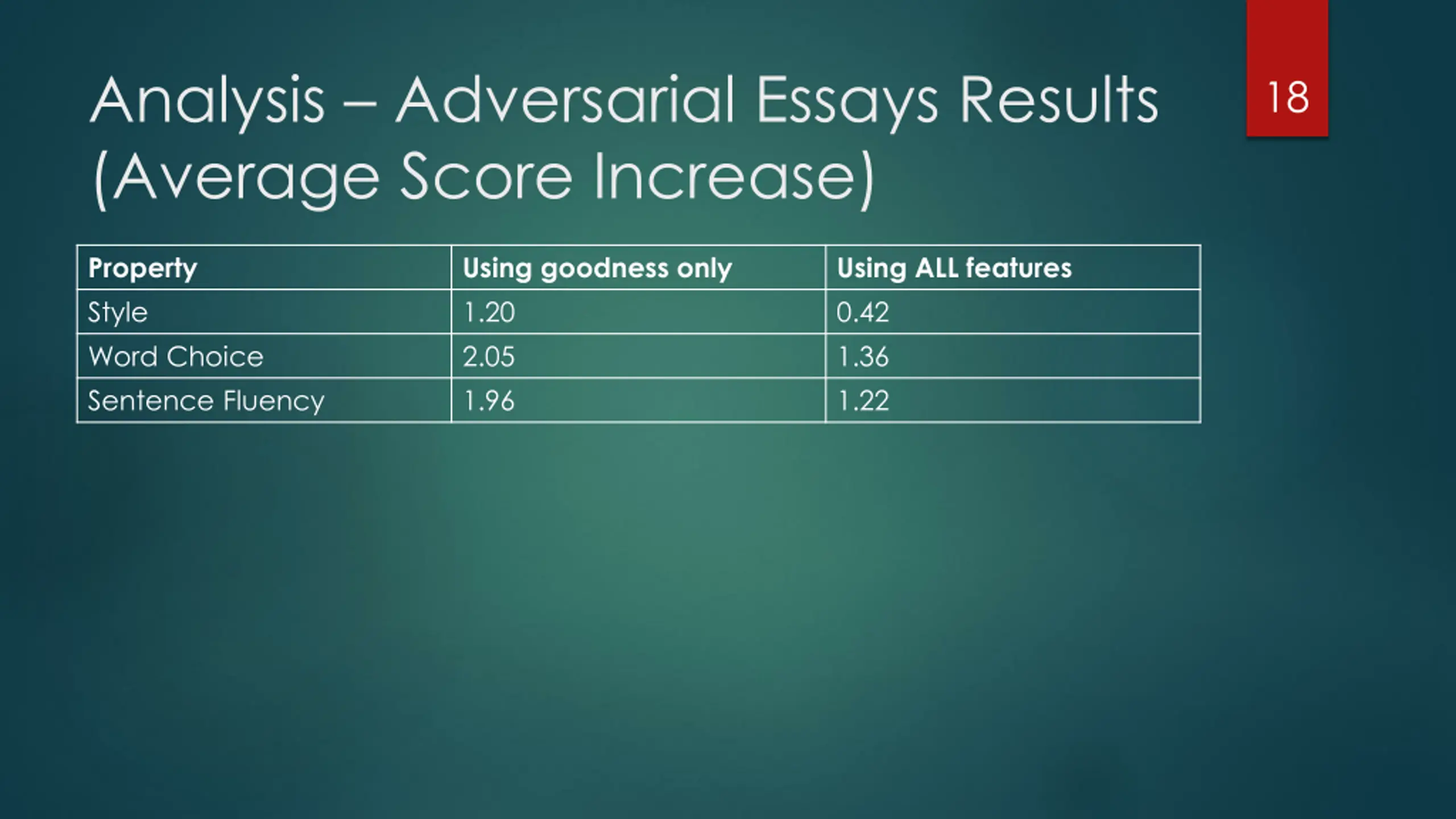 Analysis Adversarial Essays Results (Average Score Increase) 18 Property Style Word Choice Sentence Fluency Using goodness only 1.20 2.05 1.96 Using ALL features 0.42 1.36 1.22