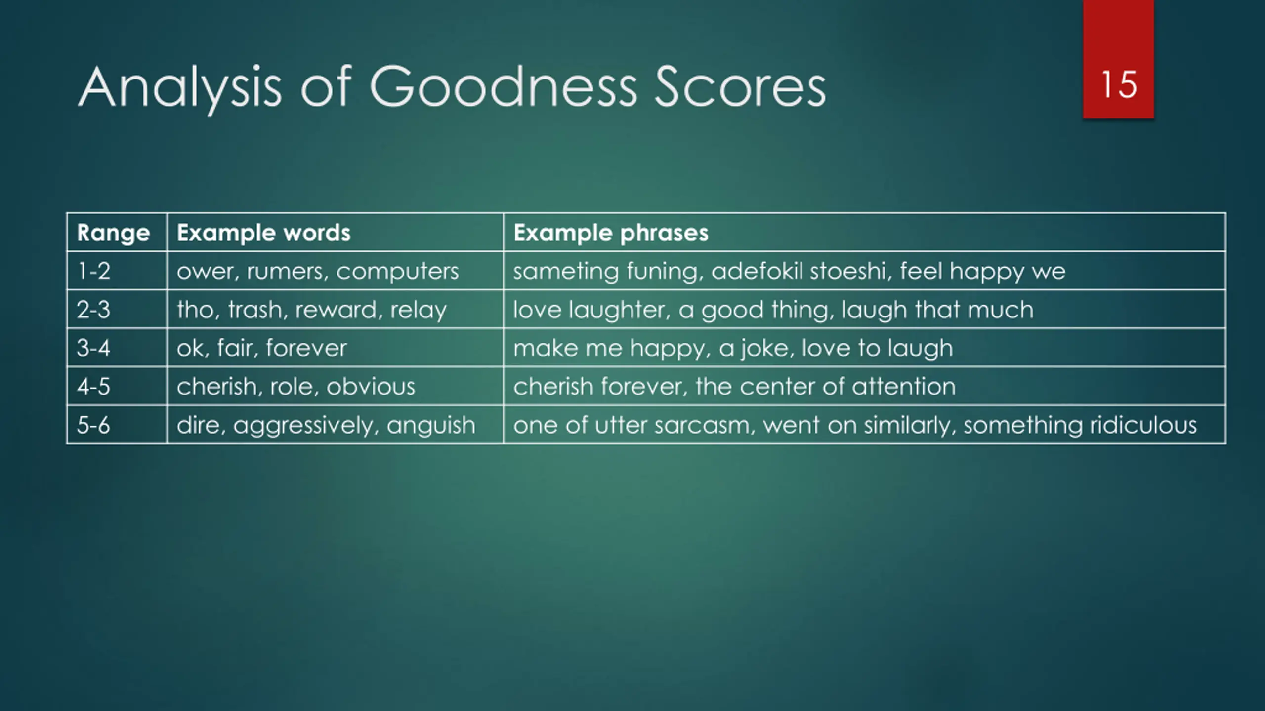 Analysis of Goodness Scores 15 Range 1-2 2-3 3-4 4-5 5-6 Example words ower, rumers, computers tho, trash, reward, relay ok, fair, forever cherish, role, obvious dire, aggressively, anguish Example phrases sameting funing, adefokil stoeshi, feel happy we love laughter, a good thing, laugh that much make me happy, a joke, love to laugh cherish forever, the center of attention one of utter sarcasm, went on similarly, something ridiculous