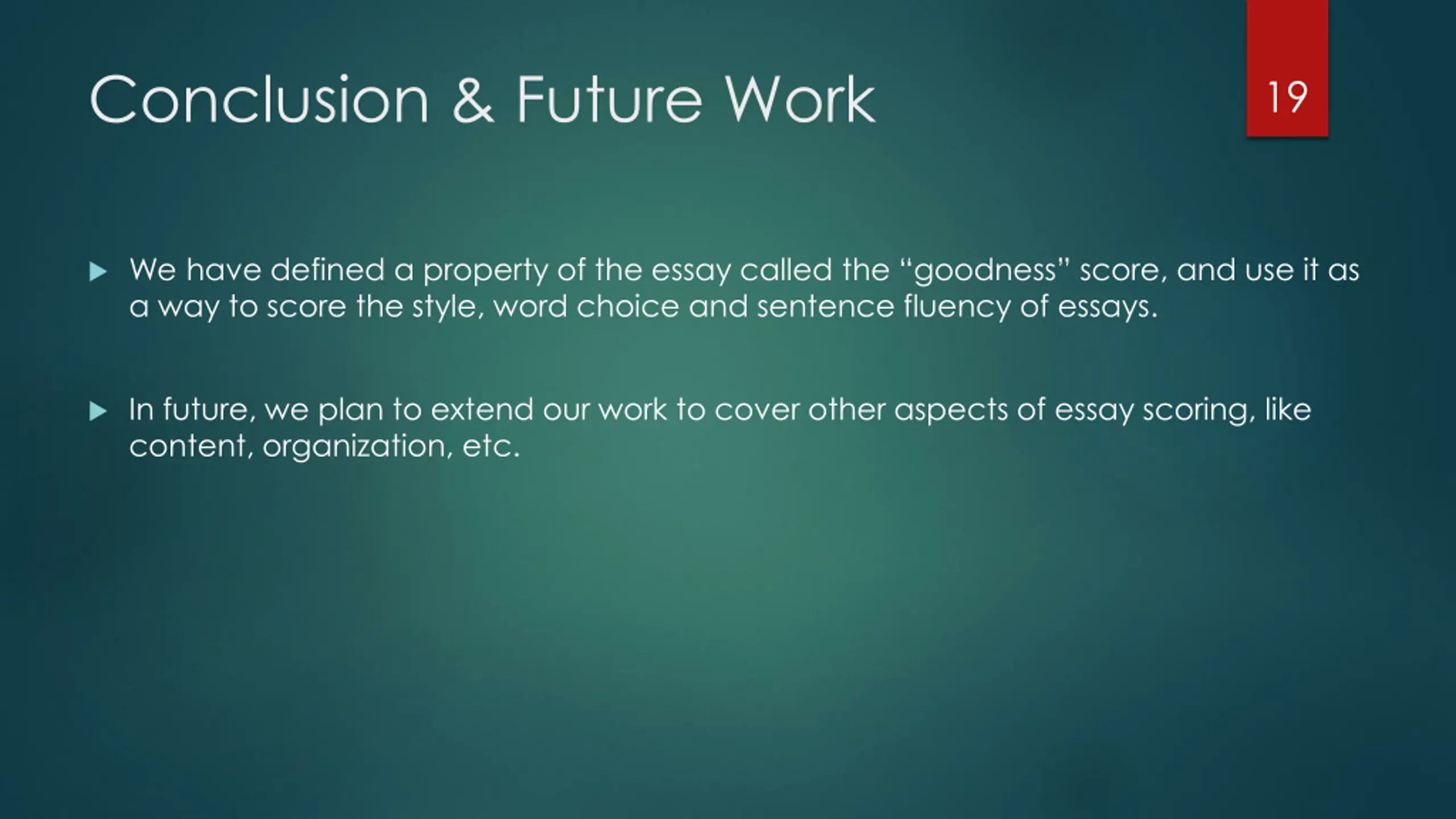 Conclusion & Future Work 19 We have defined a property of the essay called the goodness score, and use it as a way to score the style, word choice and sentence fluency of essays. In future, we plan to extend our work to cover other aspects of essay scoring, like content, organization, etc.