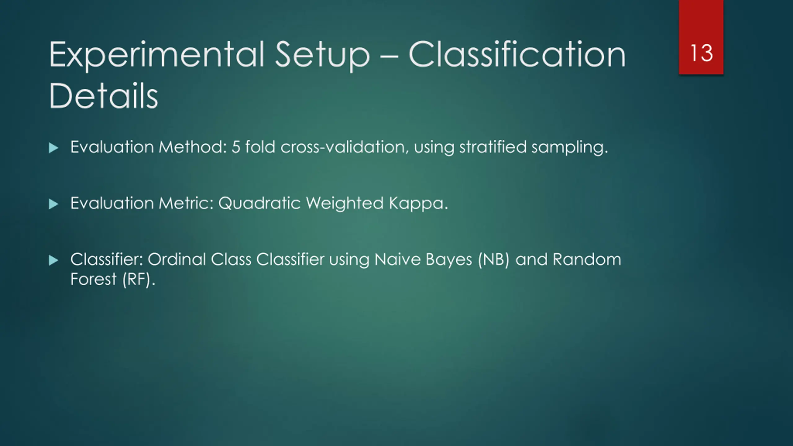 Experimental Setup Classification Details 13 Evaluation Method: 5 fold cross-validation, using stratified sampling. Evaluation Metric: Quadratic Weighted Kappa. Classifier: Ordinal Class Classifier using Naive Bayes (NB) and Random Forest (RF).